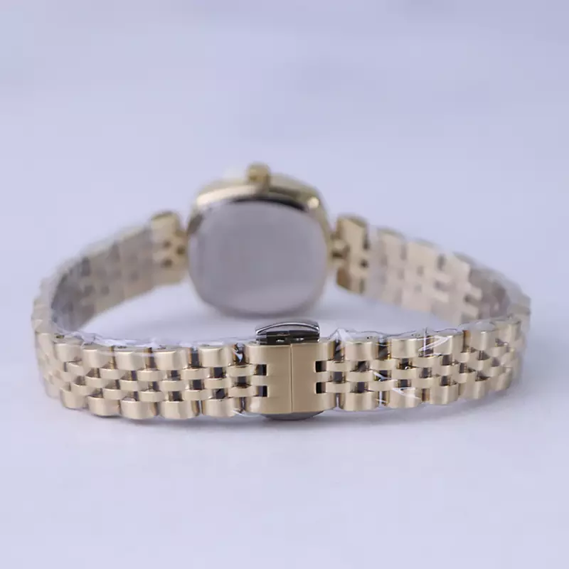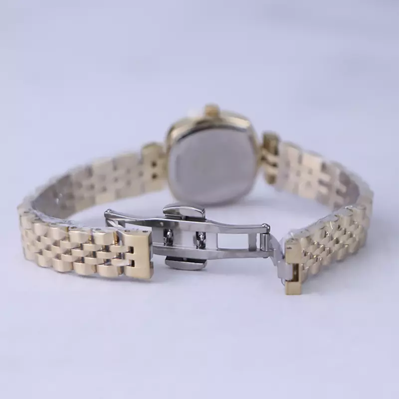 ساعت مچی الگانس زنانه استیل طلایی ظاهری کلاسیک و جذاب دارد. این ساعت استیل، رنگ ثابت و ضدحساسیت است. اصلیترین چیزی که در ساعت زنانه الگانس توجه ما را به خود جلب میکند، قاب مربع شکل و صفحهی کج ساعت است که ظاهر ساعت را شیک و متفاوت کرده است. صفحهی ساعت سبز رنگ است و عقربهها، طلایی و بدون اندکس است. اگر به درون صفحهی ساعت نگاه کنید، نام برند الگانس زیر ساعت 12 دیده میشود. در کنار صفحه یک پیچ کوک برای تنظیم زمان وجود دارد. بند ساعت، فلزی و از نوع استیل مرغوب است که باعث تعرق و خارش نمیشود. بند ساعت طلایی و طرح رولکسی است و قفل آن از مدل پروانهای دکمهدار است که از دسته قفلهای محکم و مطمئن است.