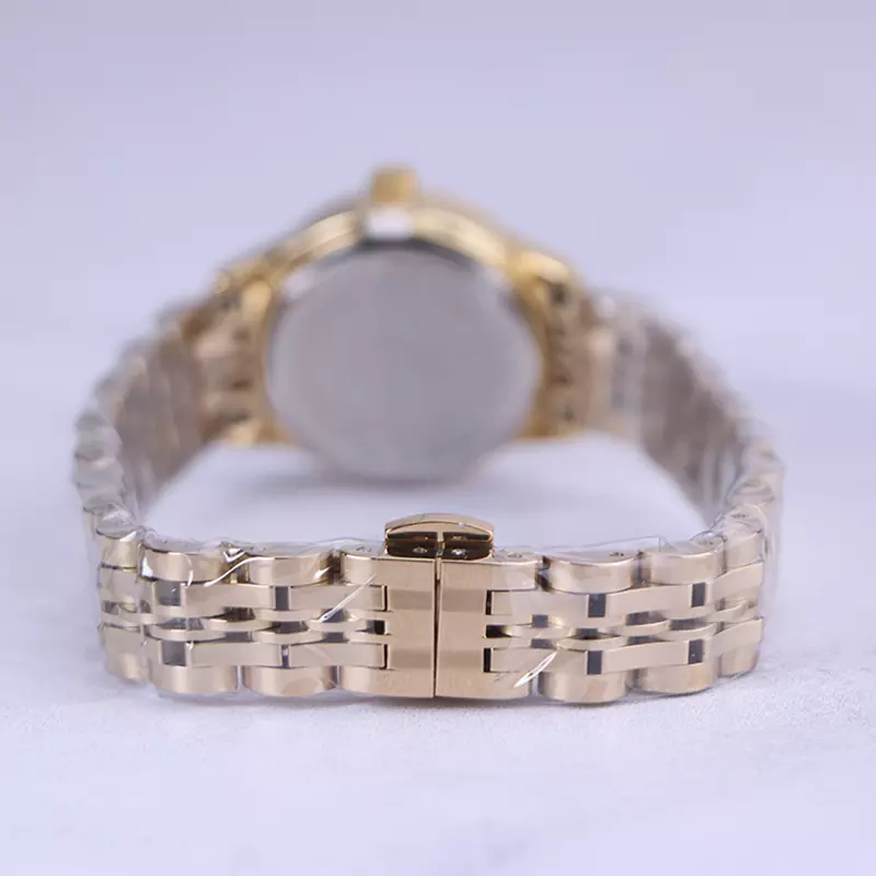 ساعت مچی الگانس زنانه استیل طلایی ظاهری کلاسیک و جذاب دارد. این ساعت استیل، رنگ ثابت و ضدحساسیت است. اصلیترین چیزی که در ساعت زنانه الگانس توجه ما را به خود جلب میکند، همخوانی رنگ بند با قاب طلایی رنگ ساعت است. صفحهی ساعت مشکی رنگ است. عقربهها، طلایی و اندکسها ترکیبی، خطی و لاتینی طراحی شده است. اگر به درون صفحهی ساعت نگاه کنید، نام برند الگانس زیر ساعت 12 دیده میشود. یک مربع در موقعیت عدد 3 قرار دارد که تقویم ساعت است. در کنار صفحه یک پیچ کوک برای تنظیم زمان وجود دارد. بند ساعت، فلزی و از نوع استیل مرغوب است که باعث تعرق و خارش نمیشود. بند ساعت طلایی و از یک بافت ریز و درشت تشکیل شده است و قفل آن از مدل پروانهای دکمهدار است که از دسته قفلهای محکم و مطمئن است.