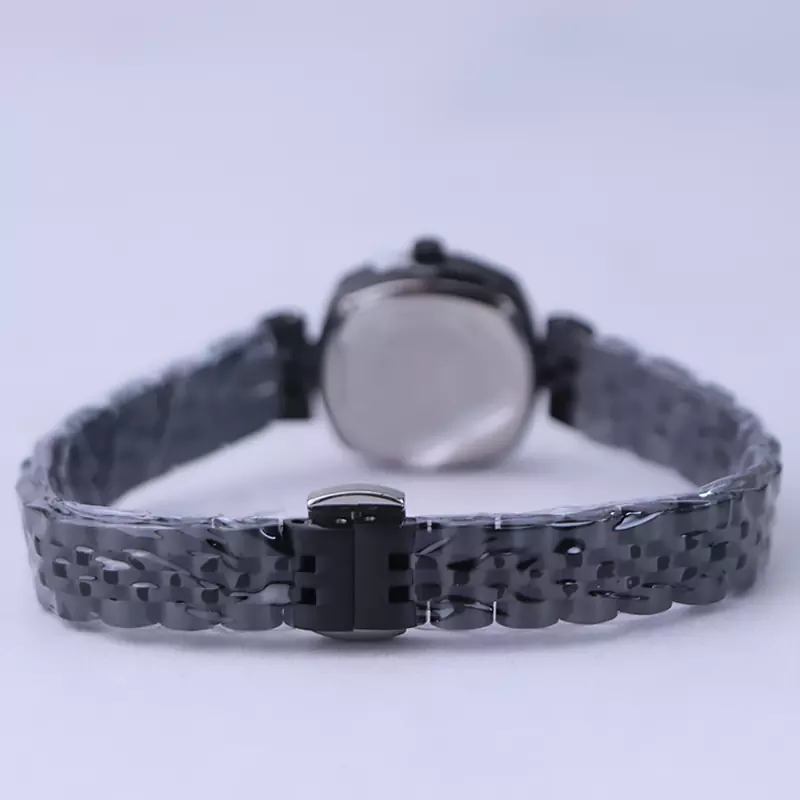 ساعت مچی الگانس زنانه استیل مشکی ظاهری کلاسیک و جذاب دارد. این ساعت استیل، رنگ ثابت و ضدحساسیت است. اصلیترین چیزی که در ساعت زنانه الگانس توجه ما را به خود جلب میکند، قاب مربع شکل و صفحهی کج ساعت است که ظاهر ساعت را شیک و متفاوت کرده است. صفحهی ساعت طلایی رنگ است و عقربهها، نقرهای و بدون اندکس است. اگر به درون صفحهی ساعت نگاه کنید، نام برند الگانس زیر ساعت 12 دیده میشود. در کنار صفحه یک پیچ کوک برای تنظیم زمان وجود دارد. بند ساعت، فلزی و از نوع استیل مرغوب است که باعث تعرق و خارش نمیشود. بند ساعت مشکی و طرح رولکسی است و قفل آن از مدل پروانهای دکمهدار است که از دسته قفلهای محکم و مطمئن است.