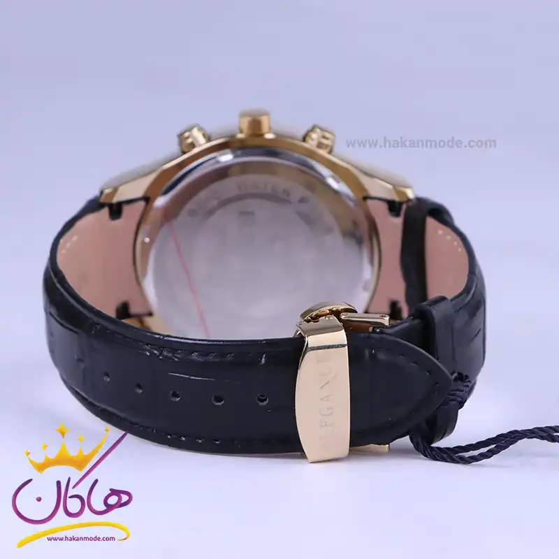 ساعت الگانس مردانه بند چرم مشکی ظاهری مدرن و جذاب دارد. قاب این ساعت به رنگ استیل طلایی، رنگ ثابت و ضدحساسیت است. در واقع این ساعت، طرح سه موتوره است و صفحات کوچکی که میبینید، نمایشی هستند. اگر به درون صفحه مشکی رنگ ساعت نگاه کنید، نام برند ELEGANCE کنار ساعت 3 دیده میشود. یک مربع کوچک کنار عدد 4 قرار دارد که همان تقویم ساعت است. داشتن اندکسهای خطی براق و عقربه های شب رنگ به شما این امکان را میدهد که در شب و محیطهای کم نور هم گذر زمان را ببینید. بند ساعت از نوع چرم مرغوب است که پوسته پوسته و بریده نمیشود، همچنین باعث تعرق و خارش نمیشود. قفل این ساعت از مدل پروانهای دکمهدار است و ساعت به راحتی از دست نمیافتد. این مدل قفل، مثل قفل کمربندی روی بند ترک یا بریدگی ایجاد نمیکند و از محبوبترین قفلها است.