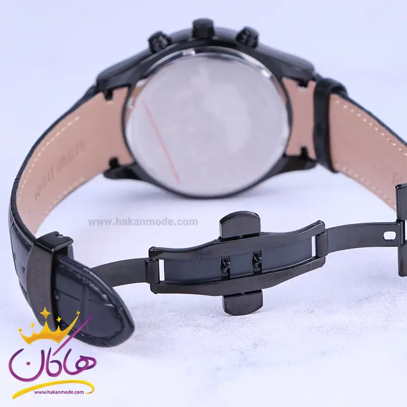 ساعت الگانس مردانه بند چرم مشکی ظاهری مدرن و جذاب دارد. قاب این ساعت به رنگ استیل مشکی، رنگ ثابت و ضدحساسیت است. در واقع این ساعت، طرح سه موتوره است و صفحات کوچکی که میبینید، نمایشی هستند. اگر به درون صفحه مشکی رنگ و طرحدار ساعت نگاه کنید، نام برند ELEGANCE کنار ساعت 3 دیده میشود. یک مربع کوچک کنار عدد 4 قرار دارد که همان تقویم ساعت است. داشتن اندکسهای خطی رزگلد و عقربه های شب رنگ به شما این امکان را میدهد که در شب و محیطهای کم نور هم گذر زمان را ببینید. بند ساعت از نوع چرم مرغوب است که پوسته پوسته و بریده نمیشود، همچنین باعث تعرق و خارش نمیشود. قفل این ساعت از مدل پروانهای دکمهدار است و ساعت به راحتی از دست نمیافتد. این مدل قفل، مثل قفل کمربندی روی بند ترک یا بریدگی ایجاد نمیکند و از محبوبترین قفلها است.
