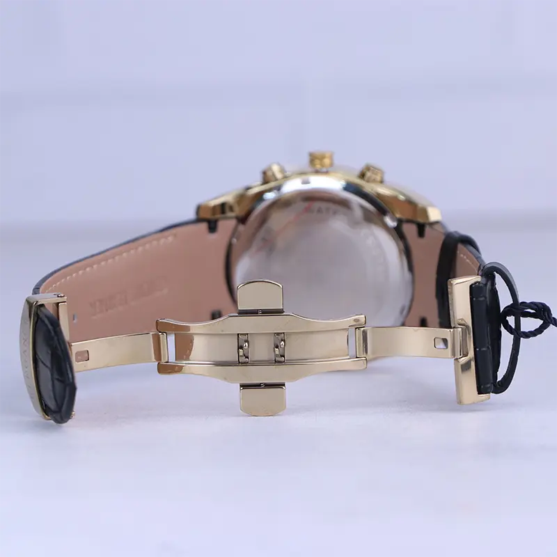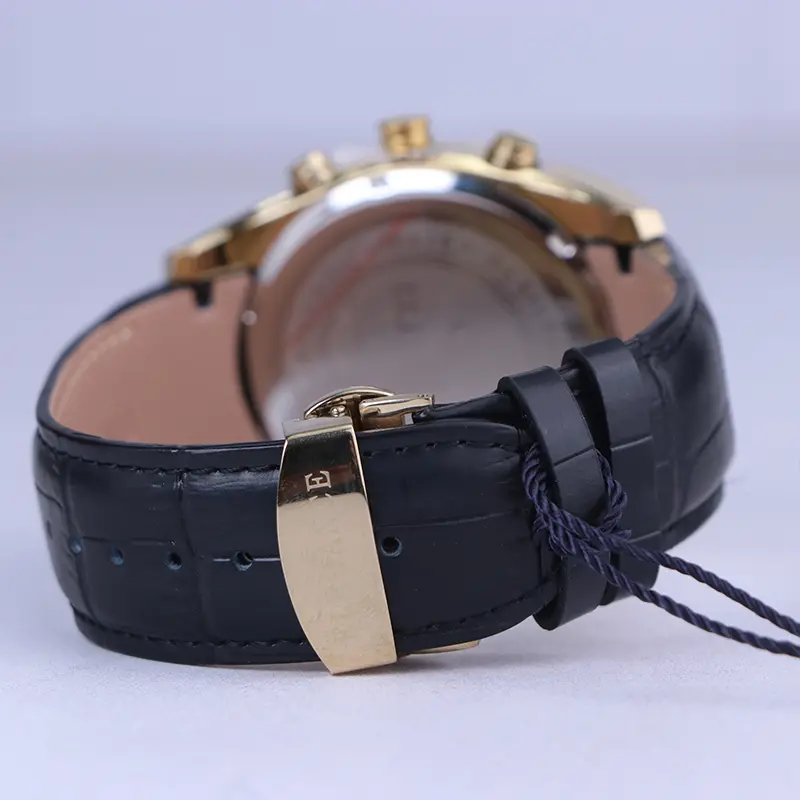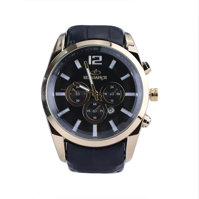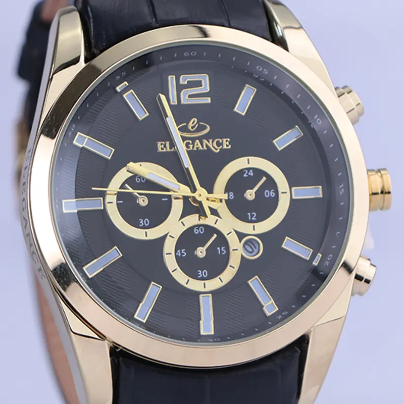 ساعت الگانس مردانه بند چرم مشکی ظاهری مدرن و جذاب دارد. قاب این ساعت به رنگ استیل طلایی، رنگ ثابت و ضدحساسیت است. در واقع این ساعت، طرح سه موتوره است و صفحات کوچکی که میبینید، نمایشی هستند. داشتن اندکسهای خطی شبنما و عقربههای شب رنگ به شما این امکان را میدهد که در شب و محیطهای کم نور هم گذر زمان را ببینید. اگر به درون صفحه مشکی رنگ ساعت نگاه کنید، نام برند ELEGANCE زیر ساعت 12 قرار دارد. یک دایره کوچک بین اعداد 4 و 5 قرار دارد که تقویم ساعت است. بند ساعت از نوع چرم مرغوب است که پوسته پوسته و بریده نمیشود، همچنین باعث تعرق و خارش نمیشود. قفل این ساعت از مدل پروانهای دکمهدار است و ساعت به راحتی از دست نمیافتد. این مدل قفل، مثل قفل کمربندی روی بند ترک یا بریدگی ایجاد نمیکند و از محبوبترین قفلها است.