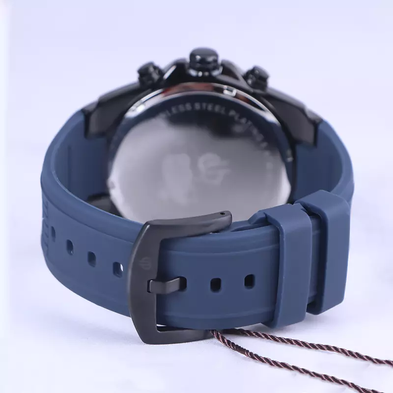 ساعت بیگوتی مردانه بند رابر ظاهری مدرن و جذاب دارد. صفحه این ساعت سرمهای رنگ و قاب آن به رنگ استیل مشکی، رنگ ثابت و ضدحساسیت است. علاوه بر ویژگیهای ظاهری اگر به داخل ساعت نگاه کنید سه صفحه دایرهای کوچک میبینید. دایرههای موجود در صفحهی ساعت شما هر کدام نشان دهندهی پارامتری خاص هستند. یک صفحه که سمت چپ قرار دارد روزهای هفته را نشان میدهد. دایره بعدی ساعت را به صورت 24 ساعت نشان میدهد و دایره وسط ساعت جهانی ساعت است. در سمت راست ساعت یک مربع کوچک بین عدد 4 و 5 بوده، آن روز شمار است و در اصل تقویم را نشان میدهد. داشتن عقربهها و اندکس های شبنما به شما این امکان را میدهد که در شب و محیطهای کم نور هم گذر زمان را ببینید. در کنار این ساعت یک پین (دسته کوک) و دو دکمه قرار دارد که برای تنظیم تقویم و ساعت است. قفل این ساعت مچی مردانه از نوع سگکی (کمربندی) است و ساعت به راحتی از دست نمیافتد. اگر به درون صفحه نگاه کنید، نام برند بیگوتی زیر ساعت 12 دیده میشود. بند ساعت از نوع رابر مرغوب که پوسته پوسته و بریده نمیشود. این بند باعث تعرق و خارش نمیشود.
