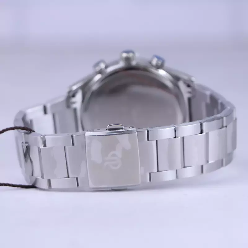 ساعت بیگوتی مردانه فلزی ظاهری مدرن و جذاب دارد. این ساعت استیل نقرهای، رنگ ثابت و ضدحساسیت است. اگر به داخل ساعت نگاه کنید، صفحهی این ساعت به رنگ سرمهای است و دو صفحه دایرهای کوچک قاب نقرهای میبینید که هر کدام از آنها نشان دهندهی پارامتری خاص هستند. صفحهی سمت چپ ساعت را به صورت 24 ساعته نشان میدهد. اگر از افرادی هستید که امور خود را بر اساس تایم 24 ساعته تنظیم میکنید این صفحه کوچک به کار شما میآید. صفحهی سمت راست، dual time یا دو زمانه است. ساعت دو زمانه ساعتی است که به طور هم زمان میتواند دو زمان مختلف مربوط به دو منطقه متفاوت را نمایش دهد. به صورتی که میتوانید با داشتن این ساعت زمان دو کشور متفاوت را در صفحهی این ساعت داشته باشید. یک مربع کوچک کنار عدد 6 قرار دارد که همان تقویم ساعت است. بند ساعت، از بافت یکدستی تشکیل شده و از نوع فلز مرغوب است که باعث تعرق و خارش نمیشود. این بند نقرهای رنگ طراحی شده است. اندکسهای این ساعت به صورت خطی نقرهای و عقربههای آن نقرهای طراحی شدهاند. لوگوی برند بیگوتی را زیر عدد 12 میبینید. قفل این ساعت از نوع دوتکه دکمهدار است. در کنار صفحه یک پیچ کوک و دو دکمه برای تنظیم زمان وجود دارد.