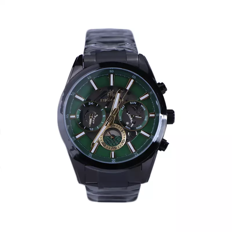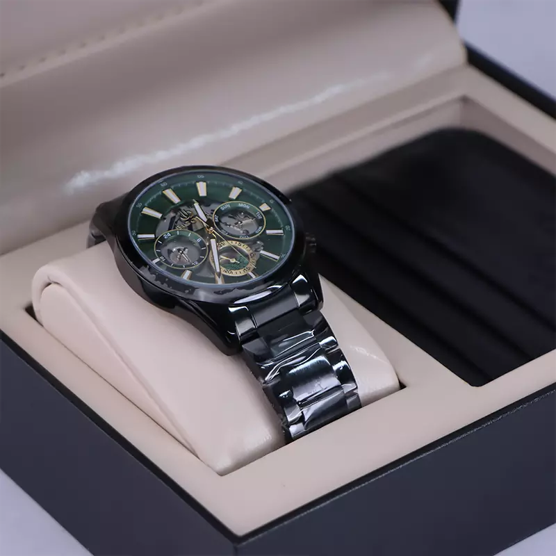 ساعت عقربه ای بیگوتی مردانه فلزی مشکی صفحه سبز BG.1.10561/6 ظاهری مدرن و جذاب دارد. این ساعت استیل مشکی، رنگ ثابت و ضدحساسیت است. اگر به داخل ساعت نگاه کنید، صفحهی این ساعت به رنگ سبز است و سه صفحه دایرهای کوچک میبینید که هر کدام از آنها نشان دهندهی پارامتری خاص هستند. یک صفحه که در سمت چپ قرار دارد ساعت را به صورت 24 ساعته نشان میدهد. اگر از افرادی هستید که امور خود را بر اساس تایم 24 ساعته تنظیم میکنید این صفحه کوچک به کار شما میآید. یک صفحه که وسط قرار دارد نشاندهندهی روزهای ماه است. صفحهی سمت راست نیز روزهای هفته را نشان میدهد. بند ساعت فلزی با بافتهای ریز و درشت و از نوع مرغوب است که باعث تعرق و خارش نمیشود. اندکسهای این ساعت به صورت خطی طلایی و عقربههای آن شبنما طراحی شدهاند. لوگوی برند بیگوتی را زیر عدد 12 میبینید. قفل این ساعت از نوع دوتکه دکمهدار است و ساعت به راحتی از دست نمیافتد. در کنار صفحه یک پیچ کوک و دو دکمه برای تنظیم زمان وجود دارد. این پک همراه با خود یک جاکارتی زیبا دارد.
