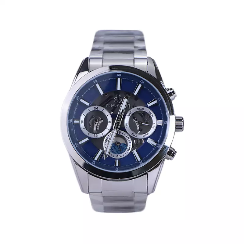 ساعت عقربه ای بیگوتی مردانه فلزی نقره ای صفحه سورمه ای همراه با جاکارتی درون جعبه