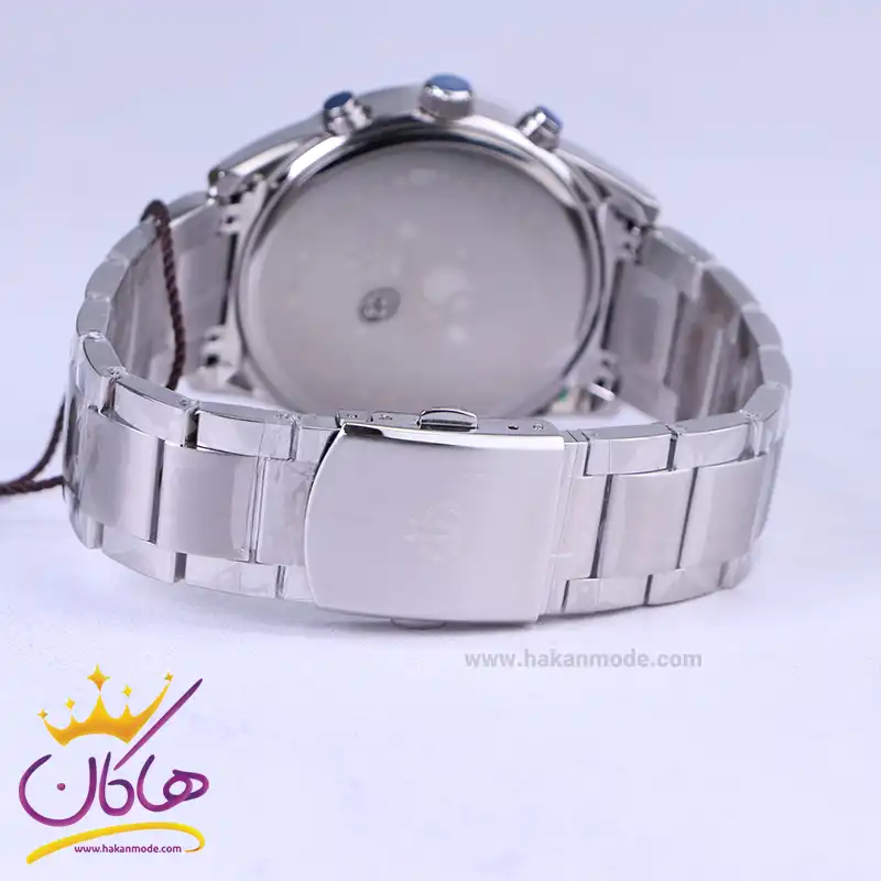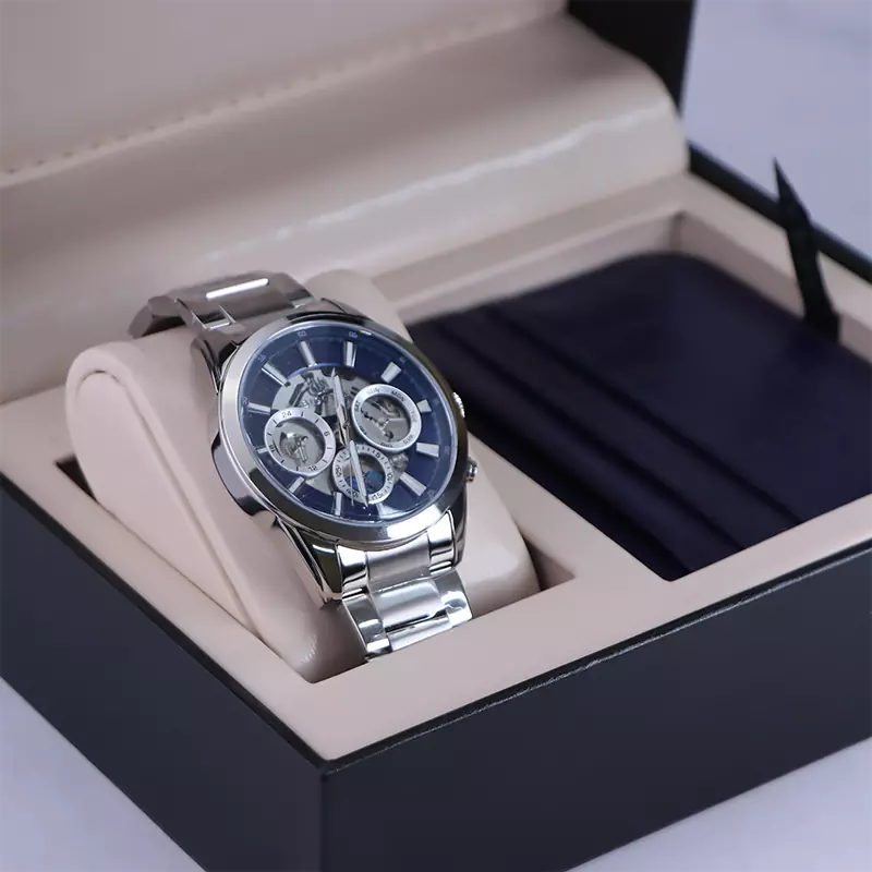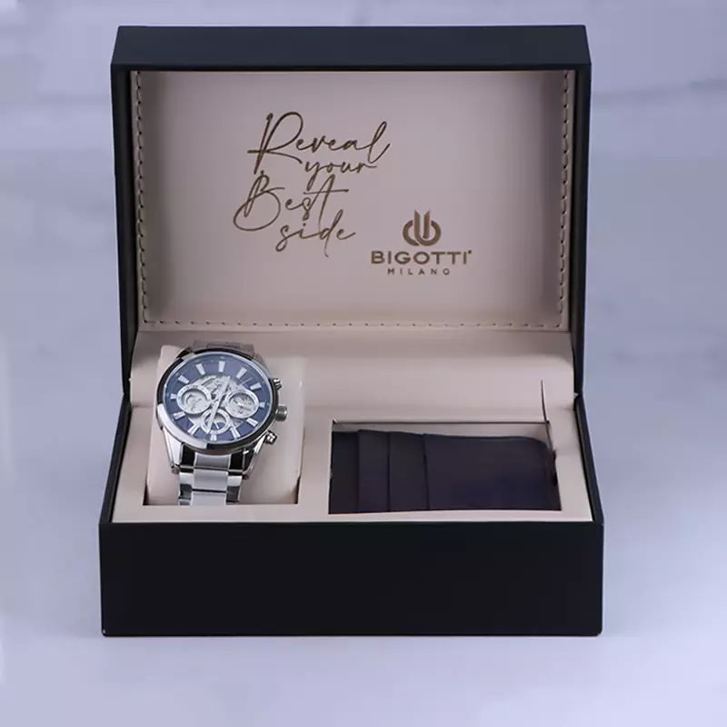 ساعت عقربه ای بیگوتی مردانه فلزی نقره ای صفحه سورمه ای BG.1.10561/3 ظاهری مدرن و جذاب دارد. این ساعت استیل نقره ای، رنگ ثابت و ضدحساسیت است. اگر به داخل ساعت نگاه کنید، حاشیه ی صفحهی این ساعت به رنگ سورمه ای است و سه صفحه دایرهای کوچک میبینید که هر کدام از آنها نشان دهندهی پارامتری خاص هستند. یک صفحه که در سمت چپ قرار دارد ساعت را به صورت 24 ساعته نشان میدهد. اگر از افرادی هستید که امور خود را بر اساس تایم 24 ساعته تنظیم میکنید این صفحه کوچک به کار شما میآید. یک صفحه که وسط قرار دارد نشاندهندهی روزهای ماه است. صفحهی سمت راست نیز روزهای هفته را نشان میدهد. بند ساعت فلزی با بافتهای ریز و درشت و از نوع مرغوب است که باعث تعرق و خارش نمیشود. اندکسهای این ساعت به صورت خطی نقره ای و عقربههای آن شبنما طراحی شدهاند. لوگوی برند بیگوتی را زیر عدد 12 میبینید. قفل این ساعت از نوع دوتکه دکمهدار است و ساعت به راحتی از دست نمیافتد. در کنار صفحه یک پیچ کوک و دو دکمه برای تنظیم زمان وجود دارد. این پک همراه با خود یک جاکارتی زیبا دارد.