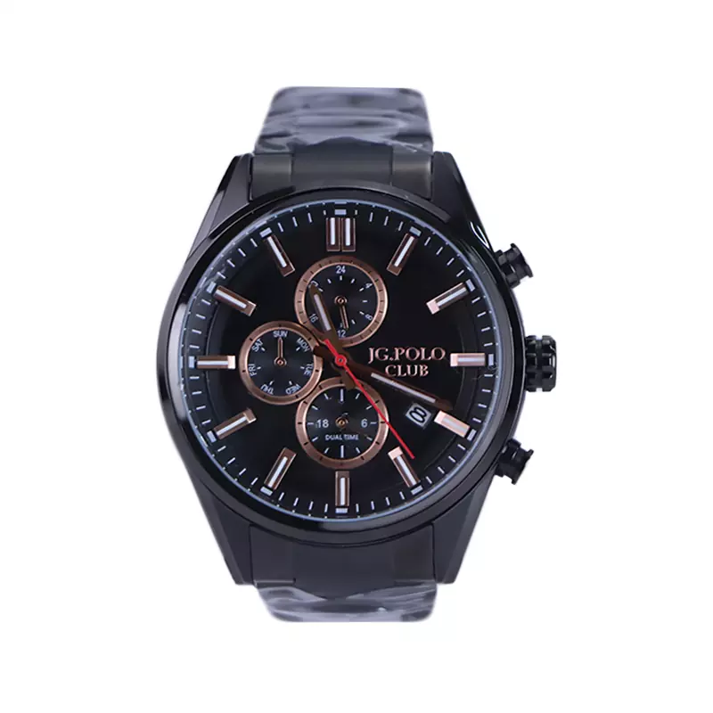 ساعت مچی جی جی پولو مردانه فلزی ظاهری مدرن و جذاب دارد. این ساعت استیل مشکی، رنگ ثابت و ضدحساسیت است. اگر به داخل ساعت نگاه کنید، صفحهی این ساعت به رنگ مشکی است و سه صفحه دایرهای کوچک میبینید که هر کدام از آنها نشان دهندهی پارامتری خاص هستند. یک صفحه که سمت چپ قرار دارد روزهای هفته را نشان میدهد. صفحهی بالایی ساعت را به صورت 24 ساعته نشان میدهد. اگر از افرادی هستید که امور خود را بر اساس تایم 24 ساعته تنظیم میکنید این صفحه کوچک به کار شما میآید. صفحهی پایینی، dual time یا دو زمانه است. ساعت دو زمانه ساعتی است که به طور هم زمان میتواند دو زمان مختلف مربوط به دو منطقه متفاوت را نمایش دهد. به صورتی که میتوانید با داشتن این ساعت زمان دو کشور متفاوت را در یک صفحه داشته باشید. یک مربع کوچک بین اعداد ۴و ۵ وجود دارد که همان تقویم ساعت است. بند ساعت فلزی با بافتهای ریز و درشت و از نوع مرغوب است که باعث تعرق و خارش نمیشود. اندکسهای این ساعت به صورت خطی رزگلد و عقربههای آن شبنما طراحی شدهاند. لوگوی برند جی جی پولو کلاب را کنار عدد 3 میبینید. قفل این ساعت از نوع دوتکه دکمهدار است و ساعت به راحتی از دست نمیافتد. در کنار صفحه یک پیچ کوک و دو دکمه برای تنظیم زمان وجود دارد.