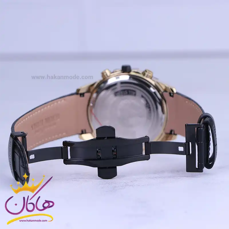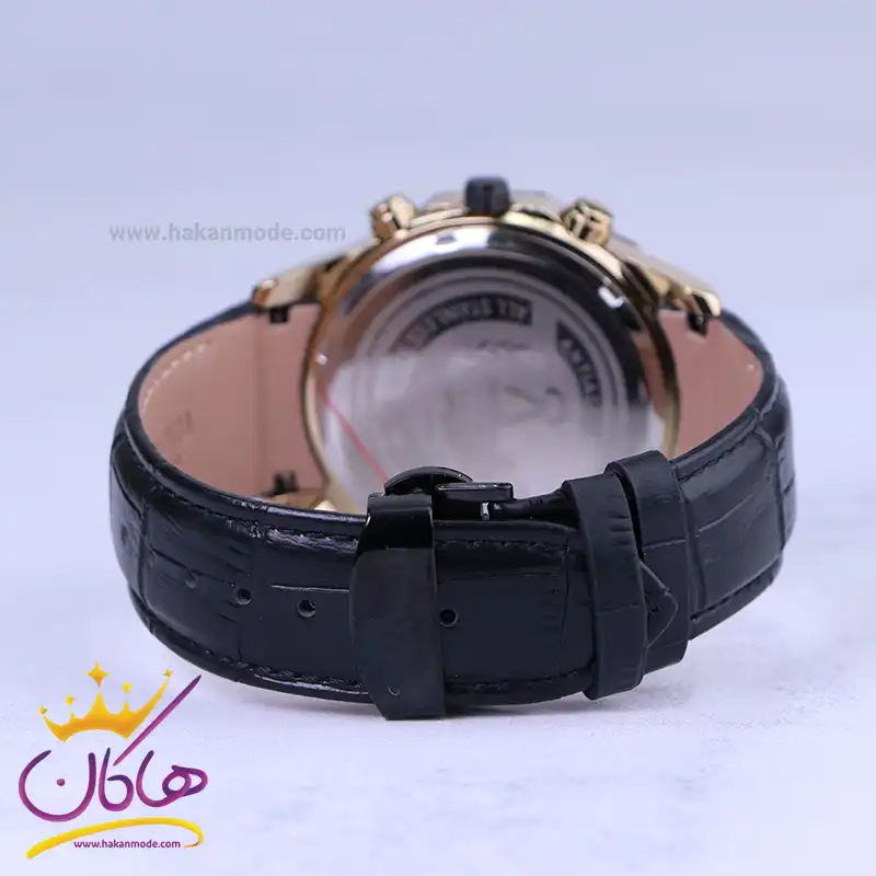 ساعت رومانسون مردانه بند چرم مشکی ظاهری مدرن و جذاب دارد. قاب این ساعت چند ضلعی و به رنگ استیل مشکی، رنگ ثابت و ضدحساسیت است. در واقع این ساعت، طرح سه موتوره است و صفحات کوچکی که میبینید، نمایشی هستند. اگر به درون صفحه مشکی رنگ ساعت نگاه کنید، نام برند رومانسون کنار ساعت 3 دیده میشود. یک مربع کوچک کنار عدد 4 قرار دارد که همان تقویم ساعت است. داشتن اندکسهای خطی طلایی و عقربه های شب رنگ به شما این امکان را میدهد که در شب و محیطهای کم نور هم گذر زمان را ببینید. بند ساعت از نوع چرم مرغوب است که پوسته پوسته و بریده نمیشود، همچنین باعث تعرق و خارش نمیشود. قفل این ساعت از مدل پروانهای دکمهدار است و ساعت به راحتی از دست نمیافتد. این مدل قفل، مثل قفل کمربندی روی بند ترک یا بریدگی ایجاد نمیکند و از محبوبترین قفلها است.