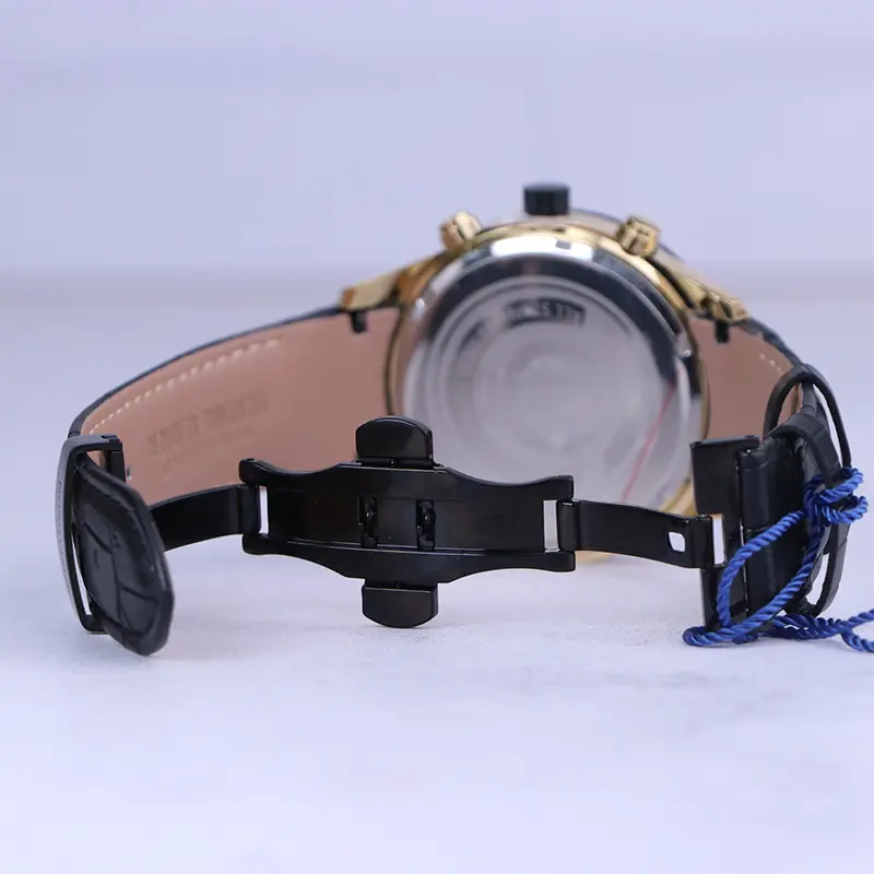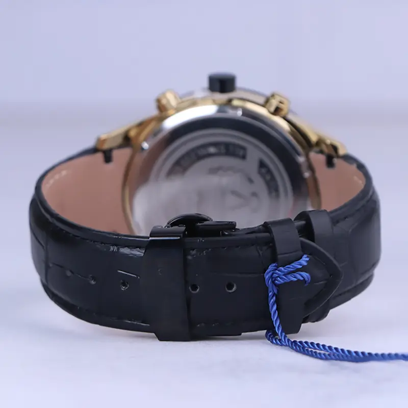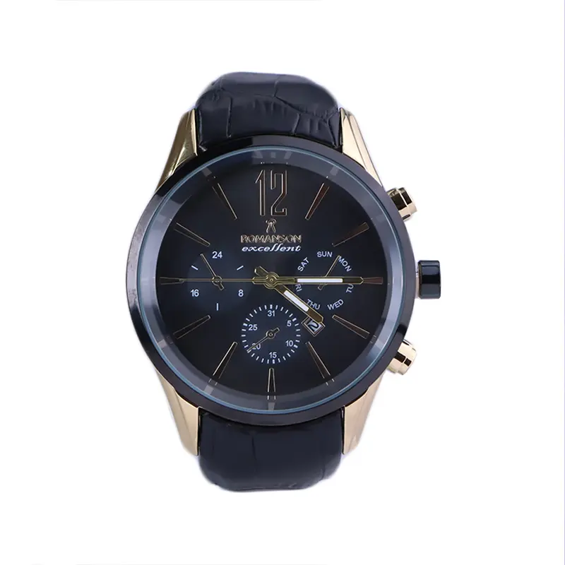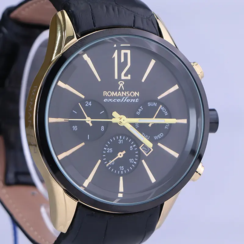 ساعت رومانسون مردانه بند چرم مشکی ظاهری مدرن و جذاب دارد. قاب این ساعت به رنگ استیل طلایی، رنگ ثابت و ضدحساسیت است. در واقع این ساعت، طرح سه موتوره است و صفحات کوچکی که میبینید، نمایشی هستند. اگر به درون صفحه مشکی رنگ ساعت نگاه کنید، نام برند romanson زیر ساعت 12 دیده میشود. یک مربع کوچک بین عدد 4 و 5 قرار دارد که همان تقویم ساعت است. داشتن اندکسهای خطی طلایی و عقربه های شب رنگ به شما این امکان را میدهد که در شب و محیطهای کم نور هم گذر زمان را ببینید. بند ساعت از نوع چرم مرغوب است که پوسته پوسته و بریده نمیشود، همچنین باعث تعرق و خارش نمیشود. قفل این ساعت از مدل پروانهای دکمهدار است و ساعت به راحتی از دست نمیافتد. این مدل قفل، مثل قفل کمربندی روی بند ترک یا بریدگی ایجاد نمیکند و از محبوبترین قفلها است.