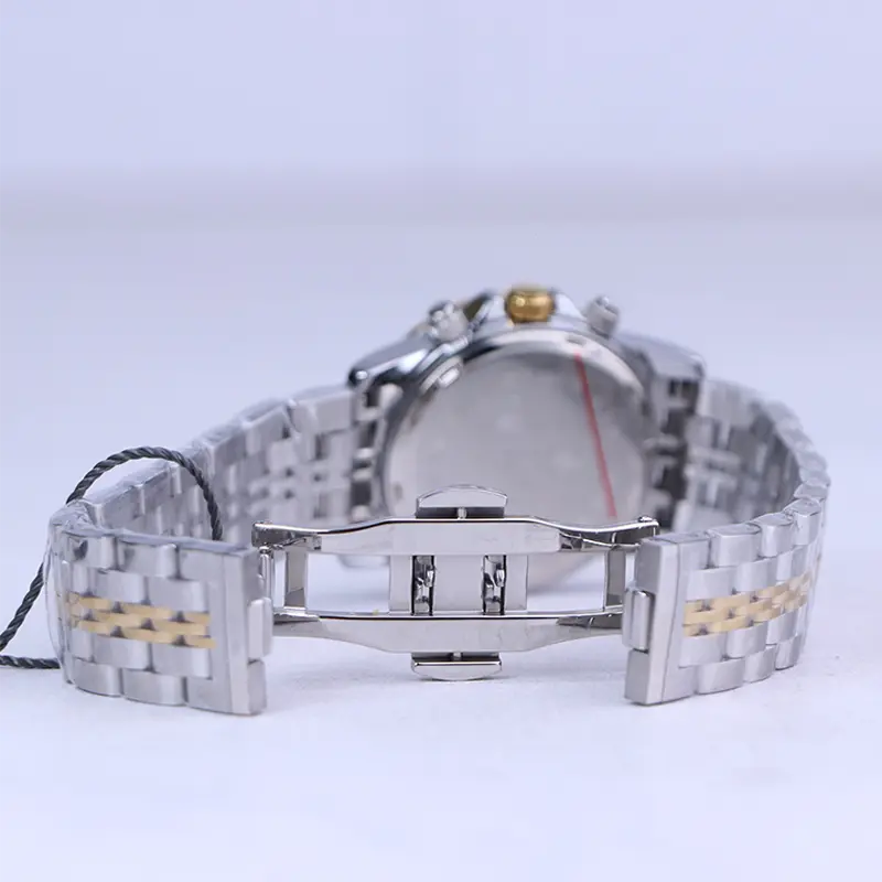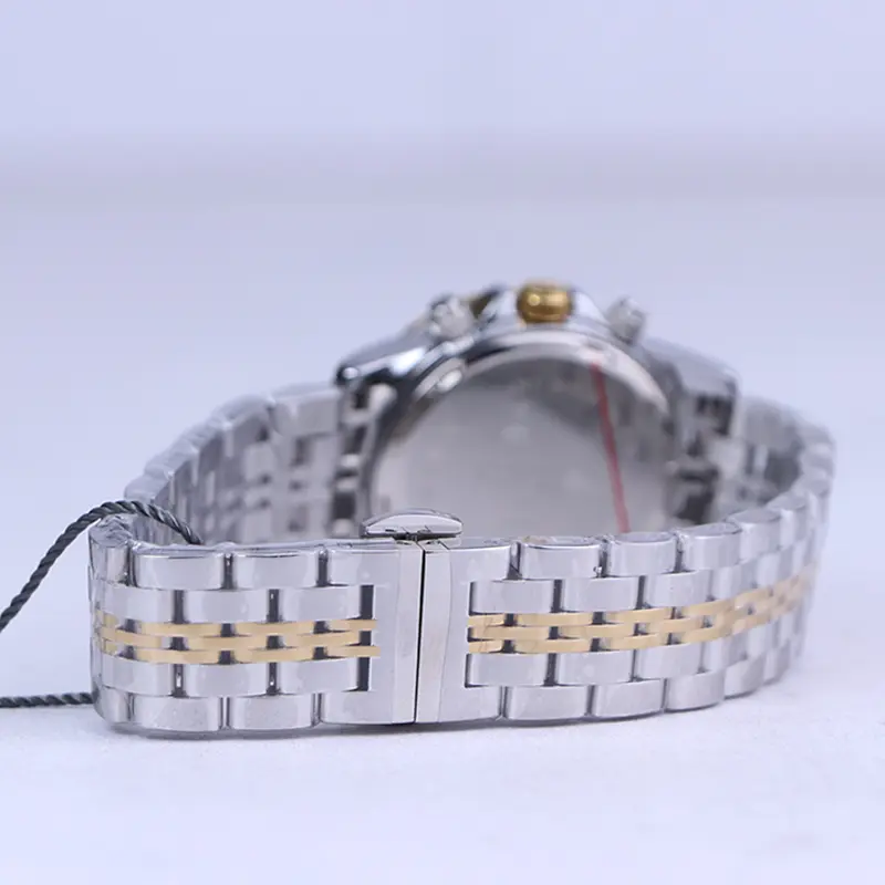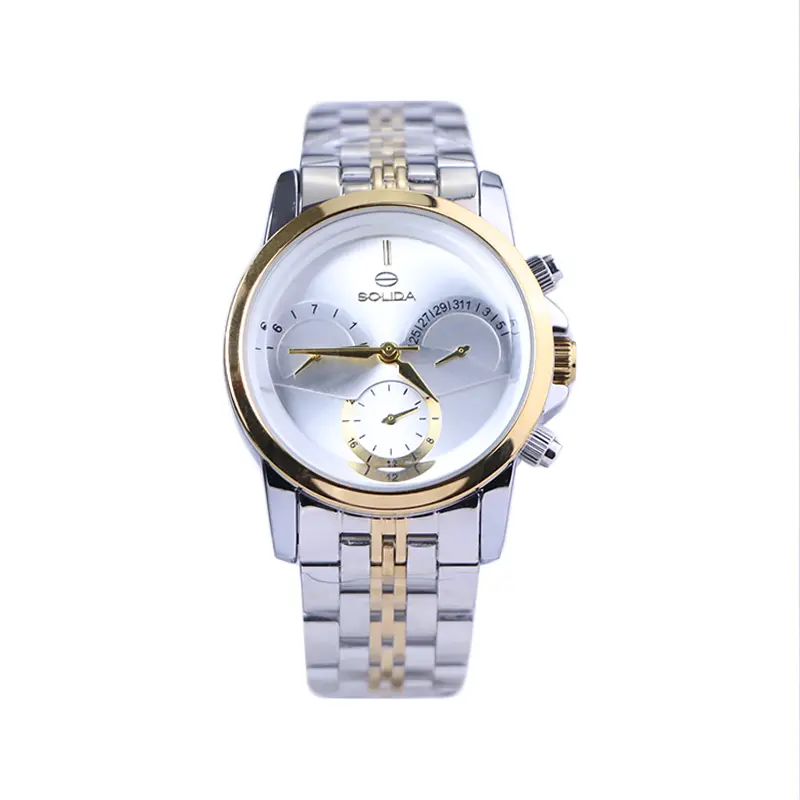 ساعت سولیدا زنانه فلزی ظاهری کلاسیک و جذاب دارد. این ساعت بند استیل نقرهای طلایی، رنگ ثابت و ضدحساسیت است. اصلیترین چیزی که در ساعت مردانه سولیدا توجه ما را به خود جلب میکند، سه صفحه دایرهای کوچک است، که درون صفحه هستند. دایرههای موجود در صفحهی سفید ساعت، هر کدام نشان دهندهی پارامتری خاص هستند. صفحهی سمت چپ روزهای هفته را نشان میدهد. صفحهی پایینی، ساعت را به صورت ۲۴ ساعت نشان میدهد. دایرهی سمت راست نشان دهندهی روزهای ماه است. این ساعت اندکس ندارد و همین امر ظاهر ساعت را شیکتر کرده است و عقربهها طلایی هستند. اگر به درون صفحه نگاه کنید، نام برند solida زیر ساعت 12 دیده میشود. در کنار صفحه سه پیچ کوک برای تنظیم زمان وجود دارد. بند ساعت، فلزی و از نوع استیل مرغوب است که باعث تعرق و خارش نمیشود. طرح این بند از یک بافت ریز و درشت تشکیل شده که قسمت میانی طلایی و کنارههای آن نقرهای رنگ است و قفل آن از مدل پروانهای دکمهدار است که از دسته قفلهای محکم و مطمئن است.
