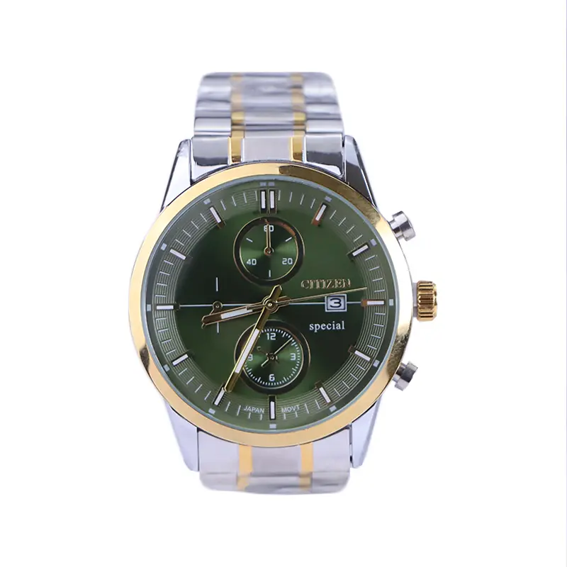 ساعت مچی سیتیزن مردانه فلزی ظاهری مدرن و جذاب دارد. این ساعت استیل نقره‌ای طلایی، رنگ ثابت و ضدحساسیت است. اصلی ترین چیزی که در ساعت سیتیزن توجه ما را به خود جلب می‌کند صفحه‌ی سبز رنگ ساعت است. در واقع این ساعت، طرح سه موتوره است و صفحات کوچکی که می‌بینید، نمایشی هستند. عقربه‌ها، شبنما و اندکس‌ها خطی و شبنما هستند. اگر به درون صفحه ساعت نگاه کنید، نام برند Citizen کنار ساعت 2 دیده می‌شود. یک مربع کوچک کنار عدد 3 قرار دارد که همان تقویم ساعت است. در کنار صفحه یک پیچ کوک برای تنظیم زمان وجود دارد. بند ساعت، فلزی و از نوع استیل مرغوب است که باعث تعرق و خارش نمی‌شود. این بند از بافت ریز و درشت تشکیل شده که قسمت میانی طلایی و کناره‌های آن نقره‌ای رنگ است. قفل ساعت از مدل پروانه‌ای دکمه‌دار است که از دسته قفل‌های محکم و مطمئن است.