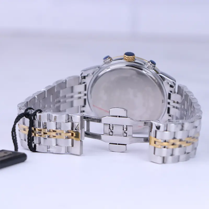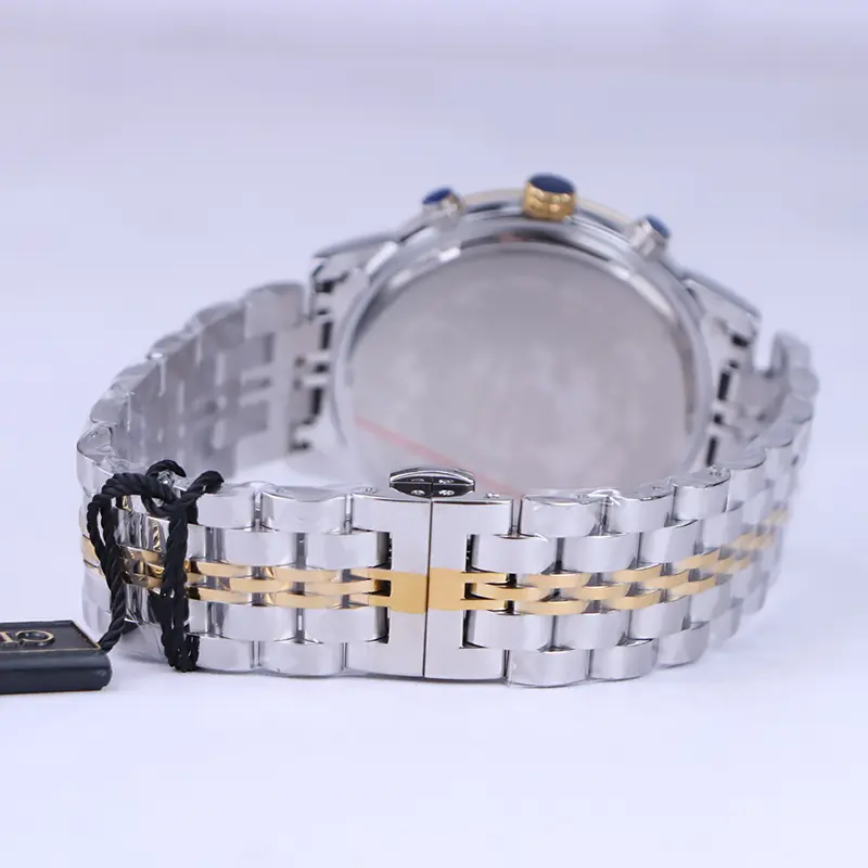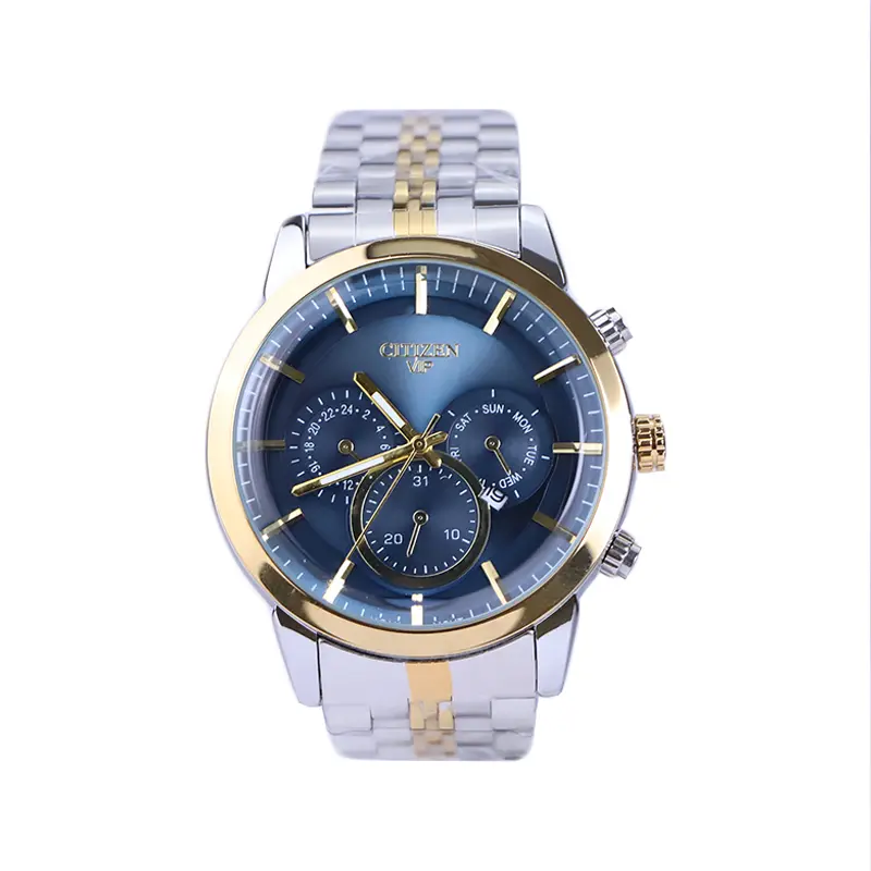 ساعت مچی سیتیزن مردانه فلزی ظاهری مدرن و جذاب دارد. این ساعت استیل نقرهای طلایی، رنگ ثابت و ضدحساسیت است. اصلی ترین چیزی که در ساعت سیتیزن توجه ما را به خود جلب میکند صفحهی آبی رنگ ساعت است. در واقع این ساعت، طرح سه موتوره است و صفحات کوچکی که میبینید، نمایشی هستند. عقربهها، شبنما و اندکسها خطی و طلایی هستند. اگر به درون صفحه ساعت نگاه کنید، نام برند Citizen زیر ساعت 12 دیده میشود. یک مربع کوچک کنار عدد 4 قرار دارد که همان تقویم ساعت است. در کنار صفحه یک پیچ کوک برای تنظیم زمان وجود دارد. بند ساعت، فلزی و از نوع استیل مرغوب است که باعث تعرق و خارش نمیشود. این بند از بافت ریز و درشت تشکیل شده که قسمت میانی طلایی و کنارههای آن نقرهای رنگ است. قفل ساعت از مدل پروانهای دکمهدار است که از دسته قفلهای محکم و مطمئن است.