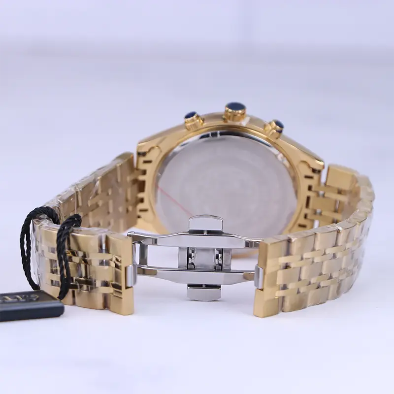 ساعت مچی سیتیزن مردانه فلزی ظاهری مدرن و جذاب دارد. این ساعت استیل طلایی، رنگ ثابت و ضدحساسیت است. اصلی ترین چیزی که در ساعت سیتیزن توجه ما را به خود جلب میکند صفحهی آبی رنگ ساعت است. در واقع این ساعت، طرح سه موتوره است و صفحات کوچکی که میبینید، نمایشی هستند. عقربهها، شبنما و اندکسها خطی و طلایی هستند. اگر به درون صفحه ساعت نگاه کنید، نام برند Citizen کنار ساعت 3 دیده میشود. یک مربع کوچک بین اعداد 4 و 5 قرار دارد که همان تقویم ساعت است. در کنار صفحه یک پیچ کوک برای تنظیم زمان وجود دارد. بند ساعت، فلزی و از نوع استیل مرغوب است که باعث تعرق و خارش نمیشود. این بند از بافت ریز و درشت تشکیل شده که طلایی رنگ است. قفل ساعت از مدل پروانهای دکمهدار است که از دسته قفلهای محکم و مطمئن است.