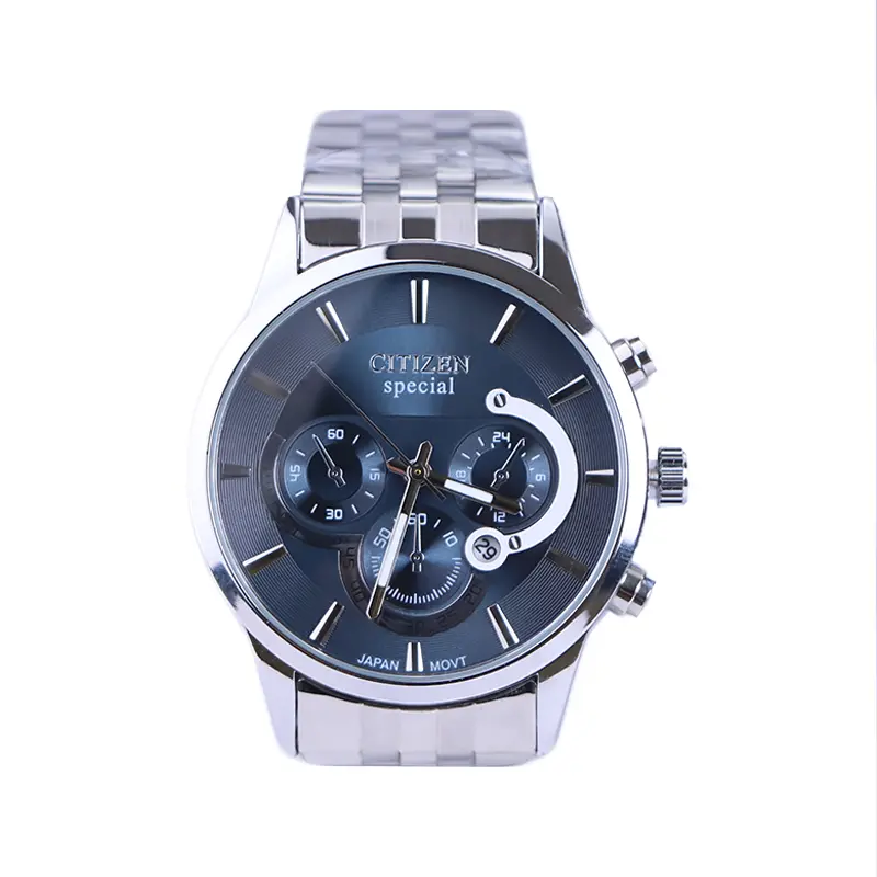 ساعت مچی سیتیزن مردانه فلزی ظاهری مدرن و جذاب دارد. این ساعت استیل نقرهای، رنگ ثابت و ضدحساسیت است. اصلی ترین چیزی که در ساعت سیتیزن توجه ما را به خود جلب میکند صفحهی آبی رنگ ساعت است. در واقع این ساعت، طرح سه موتوره است و صفحات کوچکی که میبینید، نمایشی هستند. عقربهها، شبنما و اندکسها خطی و نقرهای هستند. اگر به درون صفحه ساعت نگاه کنید، نام برند Citizen زیر ساعت 12 دیده میشود. یک دایره کوچک بین اعداد 5و4 قرار دارد که همان تقویم ساعت است. در کنار صفحه یک پیچ کوک برای تنظیم زمان وجود دارد. بند ساعت، فلزی و از نوع استیل مرغوب است که باعث تعرق و خارش نمیشود. این بند از بافت ریز و درشت تشکیل شده که نقرهای رنگ است. قفل ساعت از مدل پروانهای دکمهدار است که از دسته قفلهای محکم و مطمئن است.