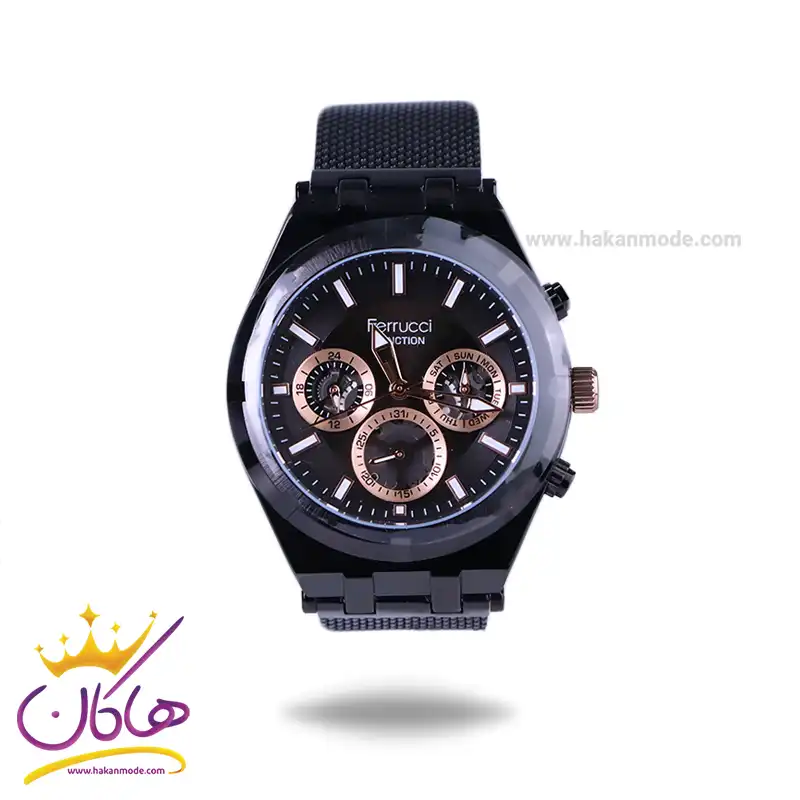 ساعت عقربه ای فروچی مردانه فلزی بند حصیری مشکی FC03290/05 ظاهری مدرن و جذاب دارد. این ساعت استیل مشکی، رنگ ثابت و ضدحساسیت است. اگر به داخل ساعت نگاه کنید، صفحه‌ی این ساعت به رنگ مشکی است و سه صفحه دایره‌ای کوچک قاب رزگلد می‌بینید که هر کدام از آنها نشان دهنده‌ی پارامتری خاص هستند. یک صفحه که در سمت راست قرار دارد روز‌های هفته را نشان می‌دهد. صفحه‌ی سمت چپ ساعت را به صورت 24 ساعته نشان می‌دهد. اگر از افرادی هستید که امور خود را بر اساس تایم 24 ساعته تنظیم می‌کنید این صفحه کوچک به کار شما می‌آید. یک صفحه که پایین قرار دارد روزهای ماه را نشان میدهد. بند ساعت، از نوع حصیری و به رنگ مشکی است. همچنین جنس بند فلزی و از نوع استیل مرغوب است که باعث تعرق و خارش نمی‌شود. قفل آن از مدل کلیپسی است که به صورت ریلی می‌توانید آن را تنظیم کنید و از دسته قفل‌های محکم و مطمئن است. اندکس‌های این ساعت به صورت خطی رزگلد و عقربه‌های آن شبنما طراحی شده‌اند. لوگوی برند فروچی را زیر عدد 12 می‌بینید. در کنار صفحه یک پیچ کوک و دو دکمه برای تنظیم زمان وجود دارد.