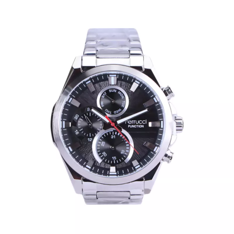 ساعت فروچی مردانه فلزی ظاهری مدرن و جذاب دارد. این ساعت استیل نقرهای، رنگ ثابت و ضدحساسیت است. اگر به داخل ساعت نگاه کنید، صفحهی این ساعت به رنگ مشکی و طرحدار است و سه صفحه دایرهای کوچک میبینید که هر کدام از آنها نشان دهندهی پارامتری خاص هستند. یک صفحه که بالا قرار دارد روزهای هفته را نشان میدهد. صفحهی سمت چپ ساعت را به صورت 24 ساعته نشان میدهد. اگر از افرادی هستید که امور خود را بر اساس تایم 24 ساعته تنظیم میکنید این صفحه کوچک به کار شما میآید. یک صفحه که پایین قرار دارد همان تقویم ساعت است. بند ساعت فلزی با بافتهای ریز و درشت و از نوع مرغوب است که باعث تعرق و خارش نمیشود. اندکسهای این ساعت به صورت خطی نقرهای و عقربههای آن شبنما طراحی شدهاند. لوگوی برند فروچی را کنار عدد 3 میبینید. قفل این ساعت از نوع دوتکه دکمهدار است و ساعت به راحتی از دست نمیافتد. در کنار صفحه یک پیچ کوک و دو دکمه برای تنظیم زمان وجود دارد.