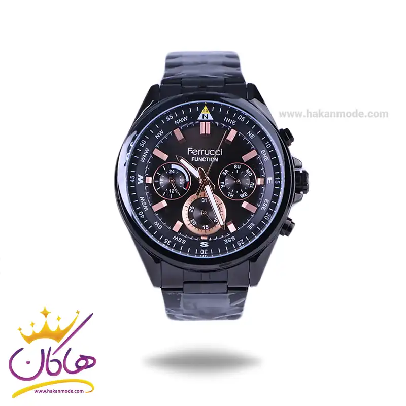 ساعت عقربه ای فروچی مردانه فلزی مشکی FC03323/03 ظاهری مدرن و جذاب دارد. این ساعت استیل مشکی، رنگ ثابت و ضدحساسیت است. اگر به داخل ساعت نگاه کنید، صفحهی این ساعت به رنگ مشکی است و سه صفحه دایرهای کوچک میبینید که هر کدام از آنها نشان دهندهی پارامتری خاص هستند. یک صفحه که در سمت راست قرار دارد روزهای هفته را نشان میدهد. صفحهی سمت چپ ساعت را به صورت 24 ساعته نشان میدهد. اگر از افرادی هستید که امور خود را بر اساس تایم 24 ساعته تنظیم میکنید این صفحه کوچک به کار شما میآید. یک صفحه که پایین قرار دارد روزهای ماه را نشان میدهد. بند ساعت فلزی با بافتهای ریز و درشت و از نوع مرغوب است که باعث تعرق و خارش نمیشود. اندکسهای این ساعت به صورت خطی رزگلد و عقربههای آن شبنما طراحی شدهاند. لوگوی برند فروچی را زیر عدد 12 میبینید. قفل این ساعت از نوع دوتکه دکمهدار است و ساعت به راحتی از دست نمیافتد. در کنار صفحه یک پیچ کوک و دو دکمه برای تنظیم زمان وجود دارد.