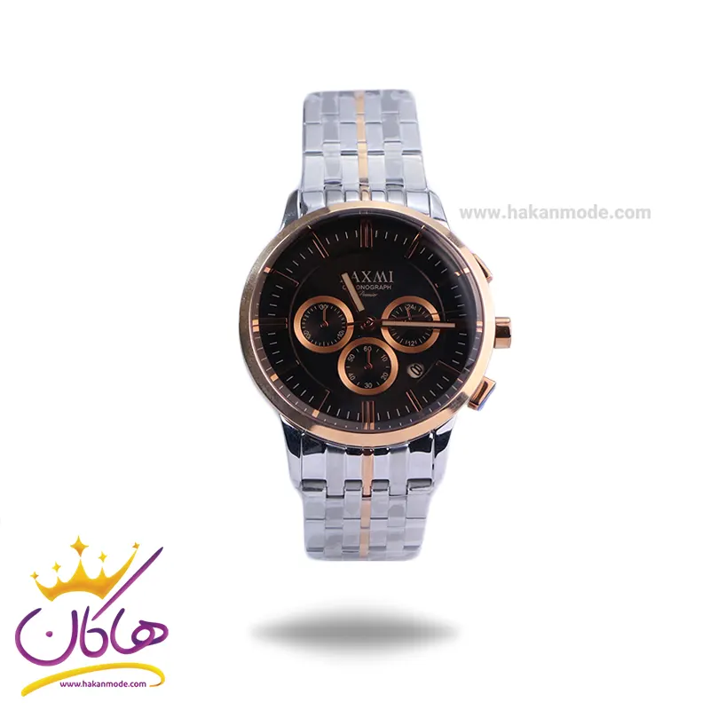ساعت لاکسمی مردانه فلزی ظاهری مدرن و جذاب دارد. این ساعت استیل نقره‌ای رزگلد، رنگ ثابت و ضدحساسیت است. اگر به داخل ساعت نگاه کنید، صفحه‌ی این ساعت به رنگ مشکی است اما تحت تاثیر شیشه‌ی رنگی آن، به رنگ قهوه‌ای نشان داده می‌شود. درون صفحه سه صفحه دایره‌ای کوچک می‌بینید که هر کدام از آنها نشان دهنده‌ی پارامتری خاص هستند. یک صفحه که سمت چپ قرار دارد ثانیه شمار کرنوگراف را نشان می‌دهد. دایره‌ی پایینی نشانگر تایم دقیقه کرنوگراف است و صفحه‌ی سمت راست ساعت را به صورت 24 ساعت نشان می‌دهد. اگر از افرادی هستید که امور خود را بر اساس تایم 24 ساعته تنظیم می‌کنید این صفحه کوچک به کار شما می‌آید. یک دایره کوچک بین اعداد 4 و 5 قرار دارد که همان تقویم ساعت است. بند ساعت، از بافت ریز و درشت تشکیل شده که قسمت میانی رزگلد و کناره‌های آن نقره‌ای رنگ است. این بند از نوع فلز مرغوب است که باعث تعرق و خارش نمی‌شود. اندکس‌های این ساعت خطی رزگلد و عقربه‌های آن شبنما طراحی شده‌اند. لوگوی برند لاکسمی را زیر عدد 12 می‌بینید. قفل این ساعت از نوع دوتکه است. در کنار صفحه یک پیچ کوک و دو دکمه برای تنظیم زمان وجود دارد.