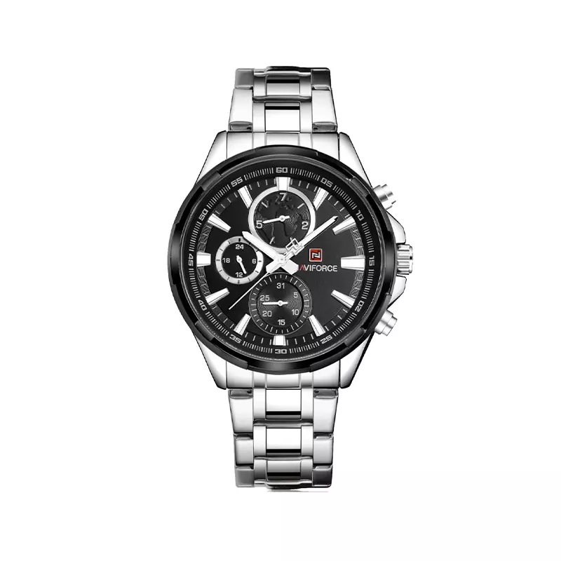 ویژگی ساعت مچی نیوی فورس فلزی نقرهای صفحه مشکی