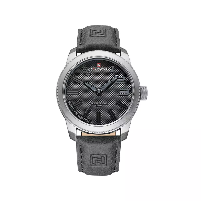 ویژگی ساعت عقربه ای نیوی فورس مردانه بند چرم طوسی 9202/9