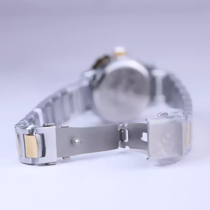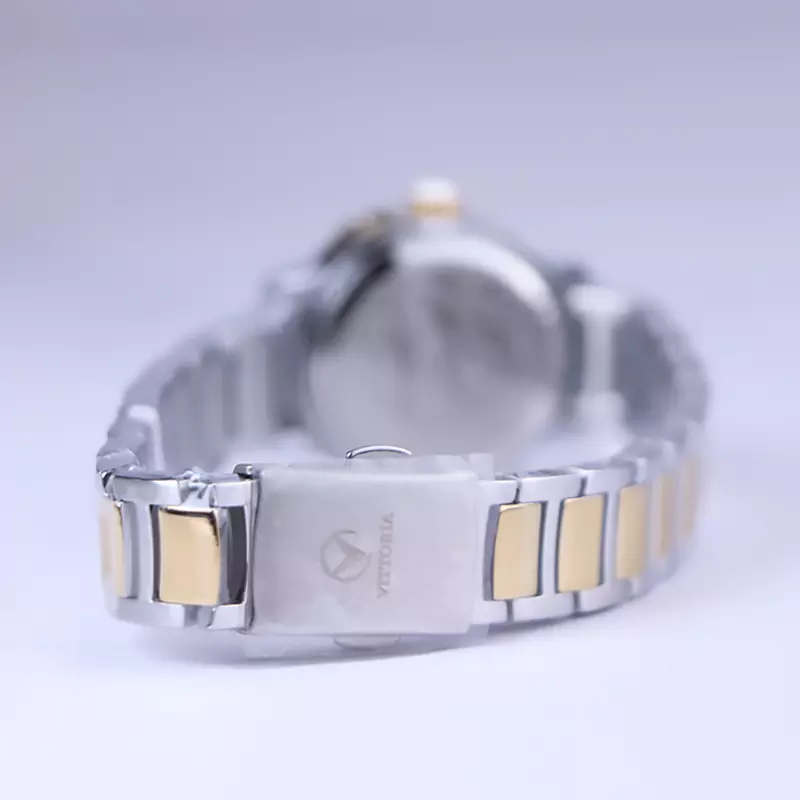 ساعت ویتوریا زنانه فلزی نقرهای طلایی ظاهری کلاسیک و جذاب دارد. این ساعت عقربهای زنانه شیک استیل، رنگ ثابت و ضدحساسیت است. اصلیترین چیزی که در ساعت زنانه ویتوریا توجه ما را به خود جلب میکند، صفحهی طلایی آینهای و قاب نگیندار ساعت است. اگر به داخل ساعت نگاه کنید این ساعت هیچگونه اندکسی ندارد و عقربههای آن طلایی هستند. نام برند ویتوریا زیر ساعت 12 دیده میشود. در کنار صفحه یک پیچ کوک برای تنظیم زمان وجود دارد. بند ساعت، از بافت ریز و درشتی تشکیل شده که قسمت میانی طلایی و کنارههای آن نقرهای رنگ است. همچنین جنس بند فلزی و از نوع استیل مرغوب است که باعث تعرق و خارش نمیشود. قفل آن از مدل دوتکه دکمهدار است که از دسته قفلهای محکم و مطمئن است.