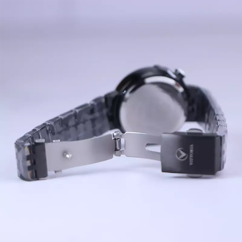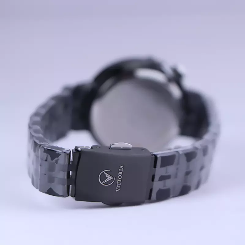 ساعت ویتوریا زنانه فلزی مشکی ظاهری کلاسیک و جذاب دارد. این ساعت عقربهای زنانه شیک استیل، رنگ ثابت و ضدحساسیت است. اصلیترین چیزی که در ساعت زنانه ویتوریا توجه ما را به خود جلب میکند، صفحهی مشکی آینهای و قاب نگیندار ساعت است. اگر به داخل ساعت نگاه کنید این ساعت هیچگونه اندکسی ندارد و عقربههای آن طلایی هستند. نام برند ویتوریا زیر ساعت 12 دیده میشود. در کنار صفحه یک پیچ کوک برای تنظیم زمان وجود دارد. بند ساعت، از بافت ریز و درشتی تشکیل شده که مشکی رنگ است. همچنین جنس بند فلزی و از نوع استیل مرغوب است که باعث تعرق و خارش نمیشود. قفل آن از مدل دوتکه دکمهدار است که از دسته قفلهای محکم و مطمئن است.