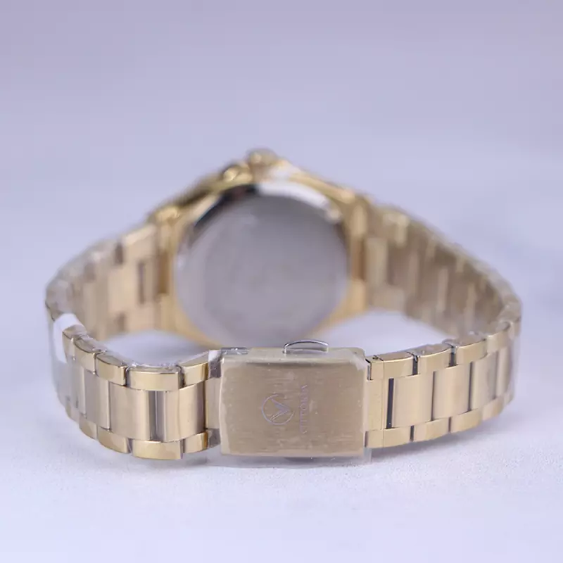 ساعت ویتوریا زنانه فلزی طلایی ظاهری کلاسیک و جذاب دارد. این ساعت عقربهای زنانه شیک استیل، رنگ ثابت و ضدحساسیت است. اصلیترین چیزی که در ساعت زنانه ویتوریا توجه ما را به خود جلب میکند، صفحهی مربع شکل و سفید رنگ ساعت است. اگر به داخل ساعت نگاه کنید اندکسهای این ساعت نگینی و عقربههای آن شبنما هستند. نام برند ویتوریا زیر ساعت 12 دیده میشود. در کنار صفحه یک پیچ کوک برای تنظیم زمان وجود دارد. بند ساعت، از بافت یکدست تشکیل شده که طلایی رنگ است. همچنین جنس بند فلزی و از نوع استیل مرغوب است که باعث تعرق و خارش نمیشود. قفل آن از مدل دوتکه دکمهدار است که از دسته قفلهای محکم و مطمئن است.