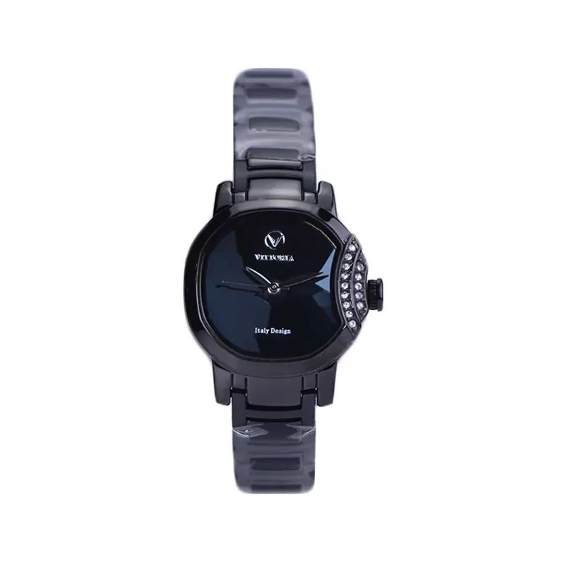 ساعت ویتوریا زنانه فلزی مشکی ظاهری کلاسیک و جذاب دارد. این ساعت عقربه‌ای زنانه شیک استیل، رنگ ثابت و ضدحساسیت است. اصلی‌ترین چیزی که در ساعت زنانه ویتوریا توجه ما را به خود جلب می‌کند، صفحه‌ی آینه‌ای و قاب نگین‌دار ساعت است. اگر به داخل ساعت نگاه کنید این ساعت هیچگونه اندکسی ندارد و عقربه‌های آن مشکی هستند. نام برند ویتوریا زیر ساعت 12 دیده می‌شود. در کنار صفحه یک پیچ کوک برای تنظیم زمان وجود دارد. بند ساعت، از بافت ریز و درشتی تشکیل شده که مشکی رنگ است. همچنین جنس بند فلزی و از نوع استیل مرغوب است که باعث تعرق و خارش نمی‌شود. قفل آن از مدل دو‌تکه دکمه‌دار است که از دسته قفل‌های محکم و مطمئن است.