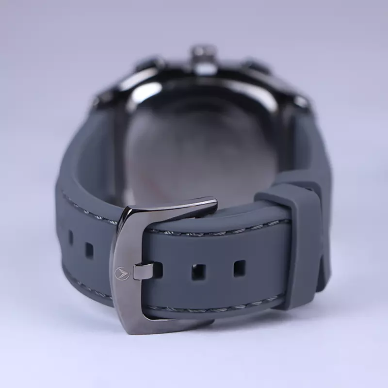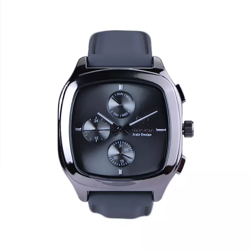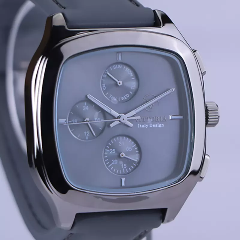 ساعت ویتوریا مردانه بند رابر ظاهری مدرن و جذاب دارد. صفحه این ساعت دودی رنگ و قاب آن مربع شکل و به رنگ استیل دودی، رنگ ثابت و ضدحساسیت است. علاوه بر ویژگیهای ظاهری اگر به داخل ساعت نگاه کنید سه صفحه دایرهای کوچک میبینید. دایرههای موجود در صفحهی ساعت شما هر کدام نشان دهندهی پارامتری خاص هستند. یک صفحه که بالا قرار دارد روزهای هفته را نشان میدهد. دایره بعدی ساعت را به صورت 24 ساعت نشان میدهد و دایره پایینی روزهای ماه را نشان میدهد. داشتن عقربهها و اندکس های شبنما به شما این امکان را میدهد که در شب و محیطهای کم نور هم گذر زمان را ببینید. در کنار این ساعت یک پین (دسته کوک) و دو دکمه قرار دارد که برای تنظیم تقویم و ساعت است. قفل این ساعت مچی مردانه از نوع سگکی (کمربندی) است و ساعت به راحتی از دست نمیافتد. اگر به درون صفحه نگاه کنید، نام برند ویتوریا کنار ساعت 3 دیده میشود. بند ساعت از نوع رابر مرغوب که پوسته پوسته و بریده نمیشود. این بند باعث تعرق و خارش نمیشود.