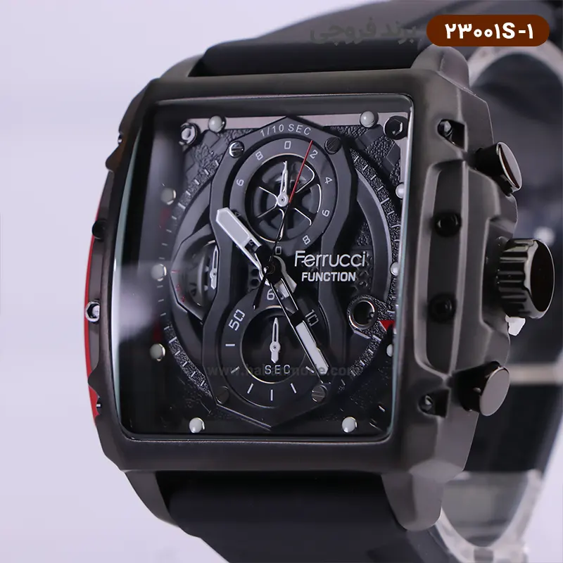 ویژگی ساعت فروچی مردانه بند رابر مشکی قاب مربع کرنوگراف 23001s/1