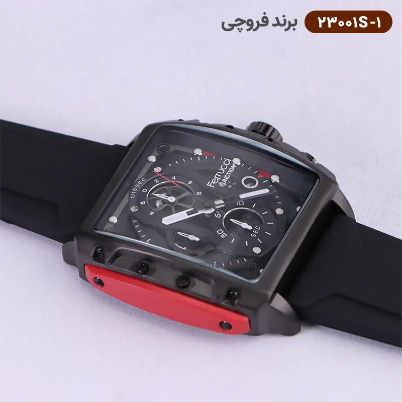 علاوه بر ویژگی‌های ظاهری اگر به داخل ساعت نگاه کنید، یک صفحه مشکی مشاهده می‌کنید. در این ساعت سه صفحه‌ی دایره‌ای، برای کرنوگراف، دقیقه شمار و ثانیه شمار قرار گرفته است. دایره‌های موجود در صفحه‌ی ساعت شما هر کدام نشان دهنده‌ی پارامتری خاص هستند. صفحه‌ی وسط برای نشان دادن دقیقه کرنوگراف است. دایره‌ی بالایی ۱/۱۰ ثانیه را نشان می‌دهد. دایره‌ی پایینی ثانیه شمار کرنوگراف است. یک دایره کوچک بین اعداد ۳ و ۴ وجود دارد که نشان دهنده‌ی تقویم ساعت است. قاب ساعت به شکل مربع است که دور تا دور آن با پیچ‌های کوچک مشکی رنگ تزئین شده است. یک سمت قاب این ساعت قرمز است که همین امر ظاهر ساعت را جذاب‌تر کرده است. عقربه‌های این ساعت به دو رنگ مشکی و سفید طراحی شده‌اند و ثانیه شمار ساعت، نیمی از آن مشکی و نیم دیگر آن قرمز است. داشتن اندکس‌های دایره‌ای نقره‌ای و عقربه‌های شبنما به شما این امکان را می‌دهد که در شب و محیط‌های کم نور هم گذر زمان را ببینید. اگر به درون صفحه دقت کنید، نام برند فروچی کنار ساعت ۳ دیده می‌شود. در کنار صفحه سه پین کوک برای تنظیم زمان و کرنوگراف وجود دارد. بند ساعت رابر مشکی رنگ، مرغوب و ضد حساسیت است. این بند باعث تعرق و خارش نمی‌شود و قفل آن از مدل کمربندی (سگکی) است که از دسته قفل‌های محکم و مطمئن بشمار می‌رود.