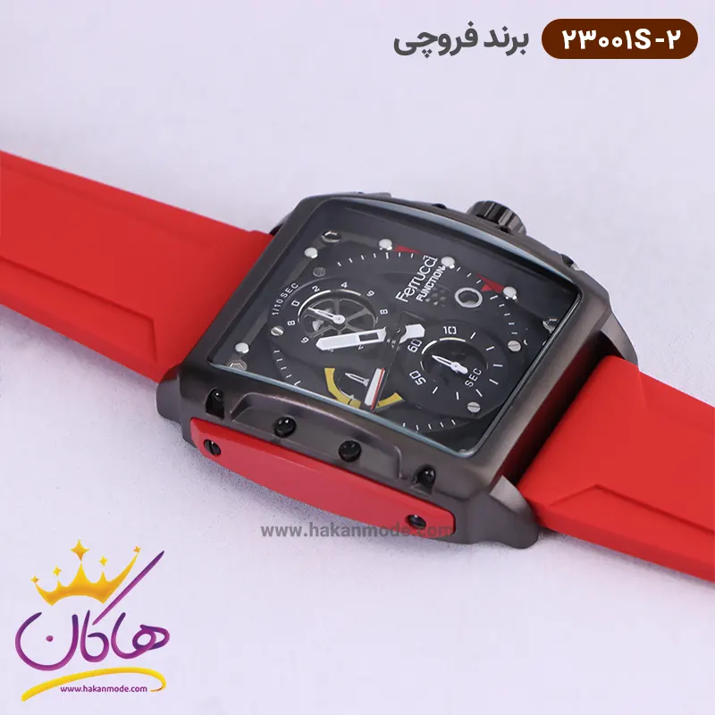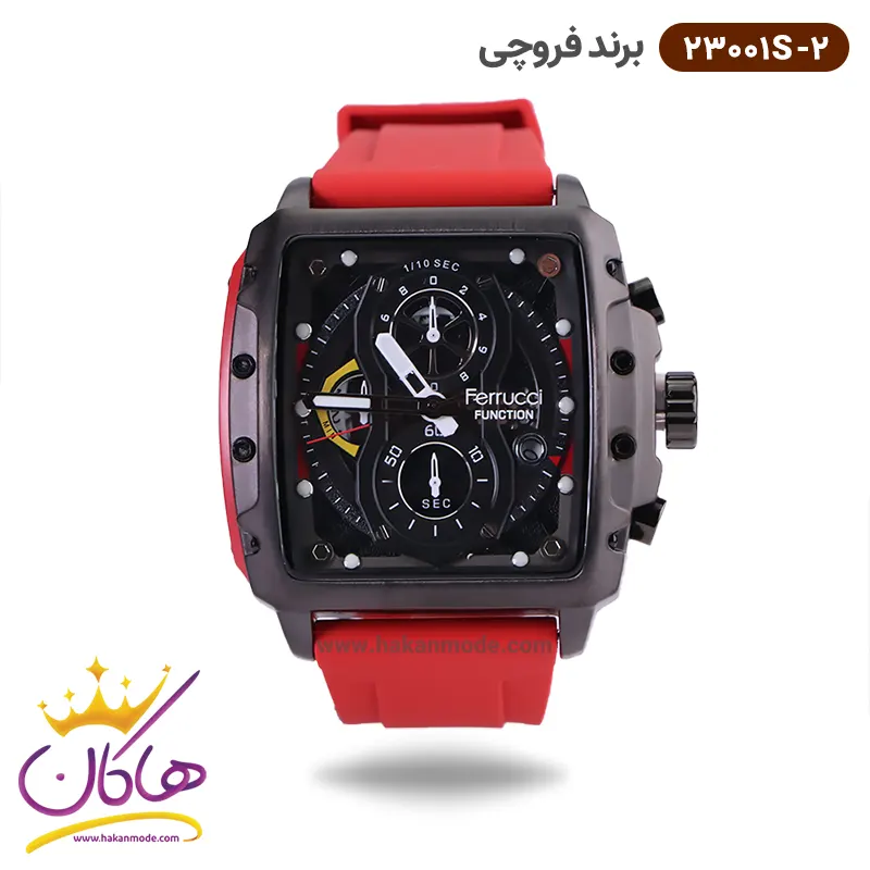 ویژگی ساعت فروچی مردانه بند رابر قرمز قاب مربع کرنوگراف 23001s/2