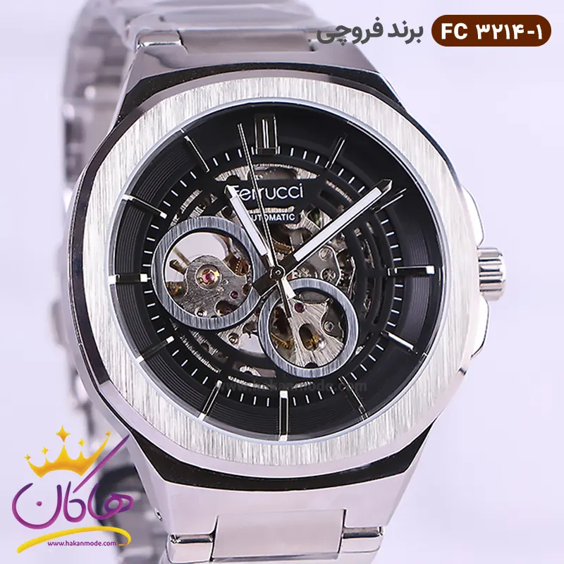 ساعت فروچی مردانه فلزی اتوماتیک نقره ای صفحه اسکلتون 03214/1 ظاهری مدرن و جذاب دارد. این ساعت استیل نقرهای، رنگ ثابت و ضدحساسیت است. علاوه بر ویژگی های ظاهری اگر به داخل ساعت نگاه کنید در وسط صفحه قطعات و اجزای موتور را مشاهده میکنید که جلوهای متفاوت نسبت به ساعتهای نرمال را نشان میدهد. اصطلاحا به این نوع صفحهها اسکلتون میگویند. داشتن موتور مکانیکی اوتومات آن را از باقی ساعتها متفاوت ساخته، به طور خلاصه کارکرد ساعت اتوماتیک با حرکت منظم مچ دست، در ارتباط است. اگر این ساعتها را به صورت منظم و روزانه، استفاده نمایید، احتیاجی به بازسازی نخواهند داشت. صفحهی ساعت مشکی رنگ است و اندکسهای این ساعت خطی و نقرهای و عقربه های آن شبنما هستند. نام برند ferrucci زیر ساعت 12 دیده میشود. در کنار صفحه یک پیچ کوک برای تنظیم زمان وجود دارد. بند ساعت، از بافت یکدست تشکیل شده و به رنگ نقرهای است. همچنین جنس بند فلزی و از نوع استیل مرغوب است که باعث تعرق و خارش نمیشود. قفل آن از مدل سهتکه دکمهدار است که از دسته قفلهای محکم و مطمئن است.