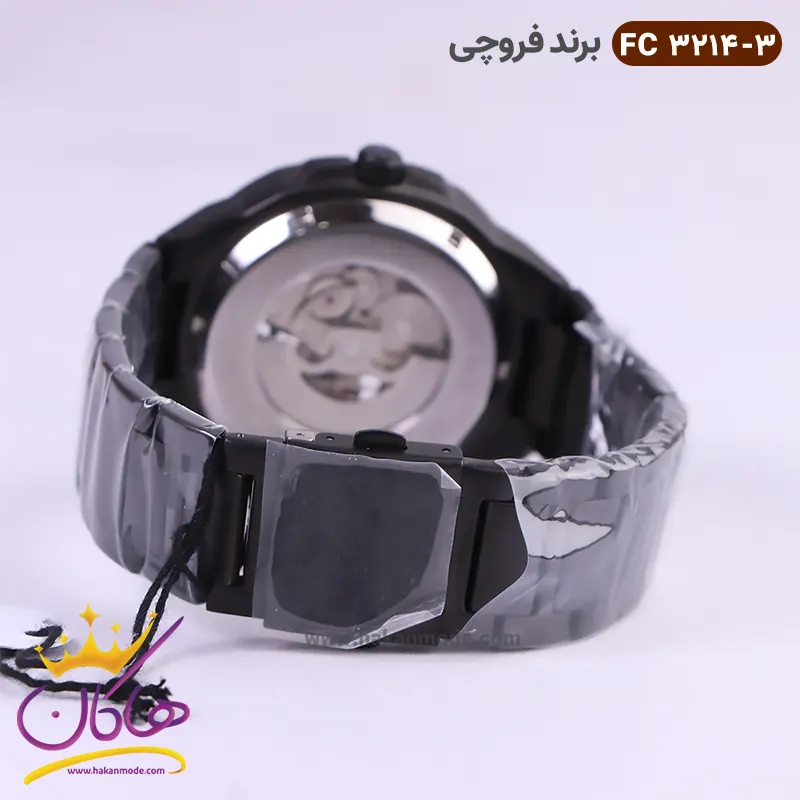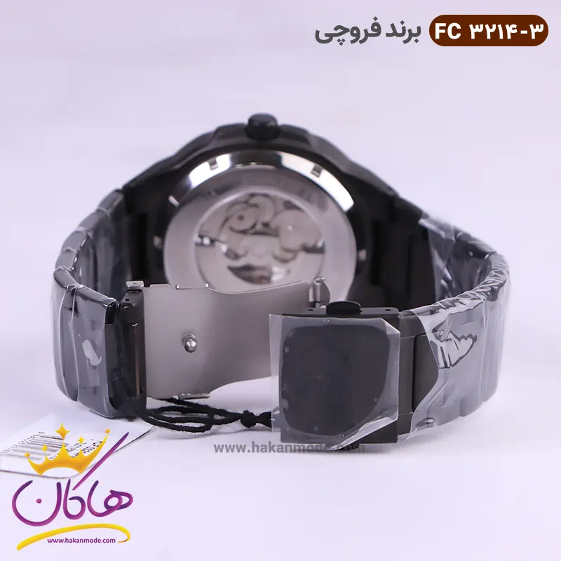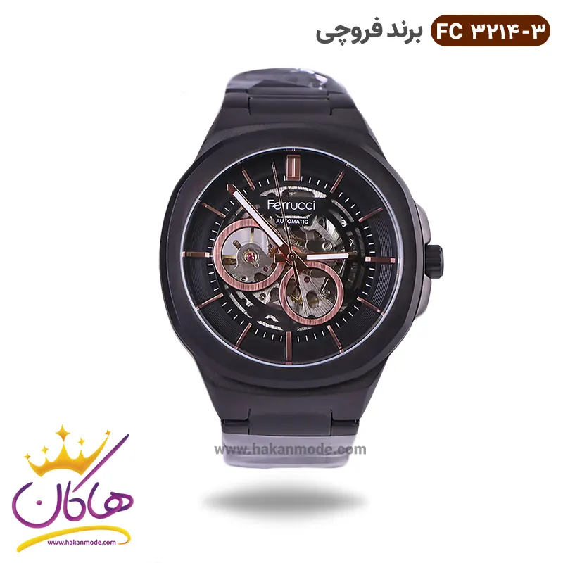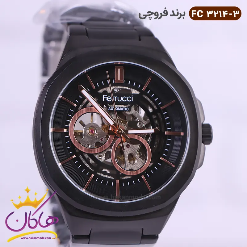 ساعت فروچی مردانه فلزی اتوماتیک مشکی صفحه اسکلتون 03214/3 ظاهری مدرن و جذاب دارد. این ساعت استیل مشکی، رنگ ثابت و ضدحساسیت است. علاوه بر ویژگی های ظاهری اگر به داخل ساعت نگاه کنید در وسط صفحه قطعات و اجزای موتور را مشاهده می‌کنید که جلوه‌ای متفاوت نسبت به ساعت‌های نرمال را نشان می‌دهد. اصطلاحا به این نوع صفحه‌ها اسکلتون می‌گویند. داشتن موتور مکانیکی اوتومات آن را از باقی ساعت‌ها متفاوت ساخته، به طور خلاصه کارکرد ساعت اتوماتیک با حرکت منظم مچ دست، در ارتباط است. اگر این ساعت‌ها را به صورت منظم و روزانه، استفاده نمایید، احتیاجی به بازسازی نخواهند داشت. صفحه‌ی ساعت مشکی رنگ است و اندکس‌های این ساعت خطی و رزگلد و عقربه های آن شبنما هستند. نام برند ferrucci زیر ساعت 12 دیده می‌شود. در کنار صفحه یک پیچ کوک برای تنظیم زمان وجود دارد. بند ساعت، از بافت یکدست تشکیل شده و به رنگ مشکی است. همچنین جنس بند فلزی و از نوع استیل مرغوب است که باعث تعرق و خارش نمی‌شود. قفل آن از مدل سه‌تکه دکمه‌دار است که از دسته قفل‌های محکم و مطمئن است.