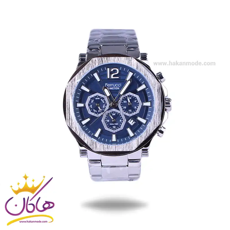 ساعت فروچی مردانه فلزی نقره ای صفحه سورمه ای FC03255/01 ظاهری مدرن و جذاب دارد. این ساعت استیل نقره ای، رنگ ثابت و ضدحساسیت است. اگر به داخل ساعت نگاه کنید، صفحهی این ساعت به رنگ سورمه ای است و سه صفحه چندضلعی کوچک میبینید که هر کدام از آنها نشان دهندهی پارامتری خاص هستند. یک صفحه که در سمت چپ قرار دارد روزهای هفته را نشان میدهد. صفحهی سمت راست ساعت را به صورت 24 ساعته نشان میدهد. اگر از افرادی هستید که امور خود را بر اساس تایم 24 ساعته تنظیم میکنید این صفحه کوچک به کار شما میآید. یک صفحه که پایین قرار دارد برای نشان دادن زمان دوم است. یعنی این ساعت به طور هم زمان میتواند دو زمان مختلف مربوط به دو منطقه متفاوت را نمایش دهد. به صورتی که میتوانید با داشتن این ساعت زمان دو کشور متفاوت را در یک صفحه داشته باشید. یک مربع کوچک بین عدد ۴ و 5 قرار دارد که همان تقویم ساعت است. بند ساعت فلزی با بافتهای ریز و درشت و از نوع مرغوب است که باعث تعرق و خارش نمیشود. اندکسهای این ساعت به صورت خطی نقره ای و عقربههای آن شبنما طراحی شدهاند. لوگوی برند فروچی را زیر عدد 12 میبینید. قفل این ساعت از نوع دوتکه دکمهدار است و ساعت به راحتی از دست نمیافتد. در کنار صفحه یک پیچ کوک و دو دکمه برای تنظیم زمان وجود دارد.