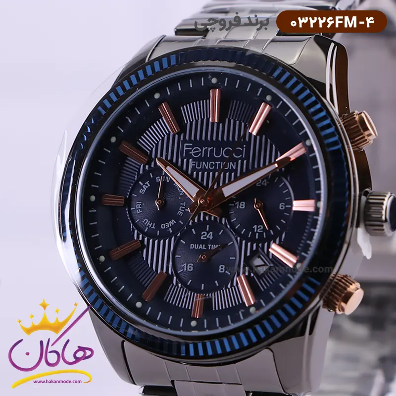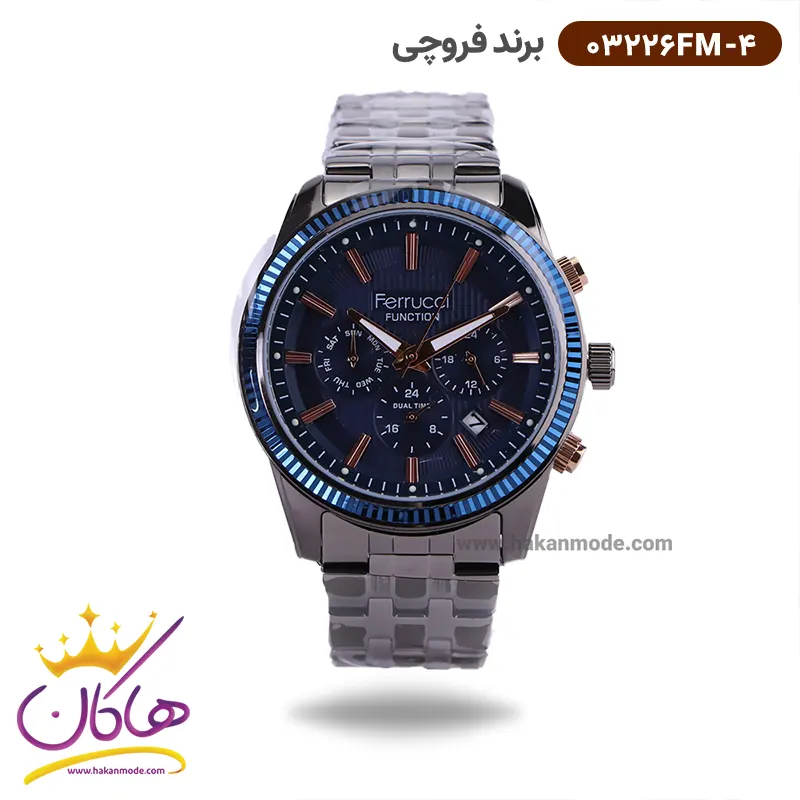 ساعت فروچی مردانه فلزی مشکی صفحه سورمه ای 03226fm-4 ظاهری مدرن و جذاب دارد. این ساعت استیل مشکی، رنگ ثابت و ضدحساسیت است. اگر به داخل ساعت نگاه کنید، صفحهی این ساعت به رنگ سورمهای طرحدار است که دور تا دور قاب آن آبی رنگ و راه راه است. درون صفحه سه دایرهی کوچک میبینید که هر کدام از آنها نشان دهندهی پارامتری خاص هستند. یک صفحه که در سمت چپ قرار دارد روزهای هفته را نشان میدهد. صفحهی سمت راست ساعت را به صورت 24 ساعته نشان میدهد. اگر از افرادی هستید که امور خود را بر اساس تایم 24 ساعته تنظیم میکنید این صفحه کوچک به کار شما میآید. یک صفحه که وسط قرار دارد dual time یا دو زمانه است. ساعت دو زمانه ساعتی است که به طور هم زمان میتواند دو زمان مختلف مربوط به دو منطقه متفاوت را نمایش دهد. به صورتی که میتوانید با داشتن این ساعت زمان دو کشور متفاوت را در یک صفحه داشته باشید. یک مربع کوچک بین عدد ۴ و ۵ قرار دارد که همان تقویم ساعت است. بند ساعت فلزی با بافتهای ریز و درشت و از نوع مرغوب است که باعث تعرق و خارش نمیشود. اندکسهای این ساعت به صورت خطی رزگلد و عقربههای آن شبنما طراحی شدهاند. لوگوی برند فروچی را زیر عدد 12 میبینید. قفل این ساعت از نوع سهتکه دکمهدار است و ساعت به راحتی از دست نمیافتد. در کنار صفحه یک پیچ کوک و دو دکمه برای تنظیم زمان وجود دارد.