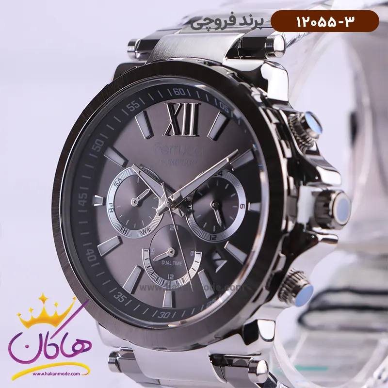 ساعت فروچی مردانه فلزی نقره ای صفحه طوسی 12055/3 ظاهری مدرن و جذاب دارد. این ساعت استیل طوسی، رنگ ثابت و ضدحساسیت است. اگر به داخل ساعت نگاه کنید، صفحهی این ساعت به رنگ طوسی است و سه صفحه دایرهای کوچک میبینید که هر کدام از آنها نشان دهندهی پارامتری خاص هستند. یک صفحه که در سمت چپ قرار دارد روزهای هفته را نشان میدهد. صفحهی سمت راست ساعت را به صورت 24 ساعته نشان میدهد. اگر از افرادی هستید که امور خود را بر اساس تایم 24 ساعته تنظیم میکنید این صفحه کوچک به کار شما میآید. یک صفحه که وسط قرار دارد dual time یا دو زمانه است. ساعت دو زمانه ساعتی است که به طور هم زمان میتواند دو زمان مختلف مربوط به دو منطقه متفاوت را نمایش دهد. به صورتی که میتوانید با داشتن این ساعت زمان دو کشور متفاوت را در یک صفحه داشته باشید. یک مربع کوچک بین عدد ۴ و ۵ قرار دارد که همان تقویم ساعت است. بند ساعت فلزی با بافتهای ریز و درشت و از نوع مرغوب است که باعث تعرق و خارش نمیشود. اندکسهای این ساعت به صورت خطی نقرهای و عقربههای آن شبنما طراحی شدهاند. فقط اندکس موقعیت ساعت ۱۲ به صورت لاتین است. لوگوی برند فروچی را زیر عدد 12 میبینید. قفل این ساعت از نوع سهتکه دکمهدار است و ساعت به راحتی از دست نمیافتد. در کنار صفحه یک پیچ کوک و دو دکمه برای تنظیم زمان وجود دارد.