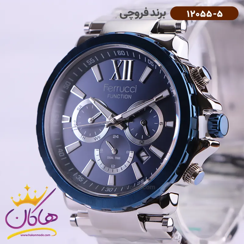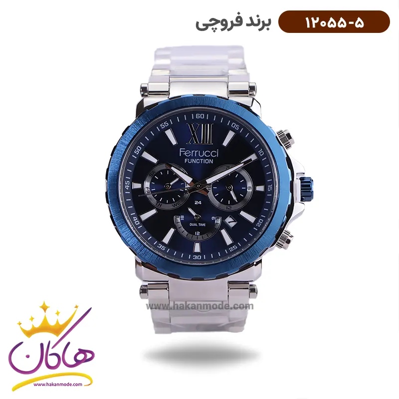 ساعت فروچی مردانه فلزی نقره ای صفحه سورمه ای 12055/5 ظاهری مدرن و جذاب دارد. این ساعت استیل نقره‌ای، رنگ ثابت و ضدحساسیت است. اگر به داخل ساعت نگاه کنید، صفحه‌ی این ساعت به رنگ سورمه‌ای است و سه صفحه دایره‌ای کوچک می‌بینید که هر کدام از آنها نشان دهنده‌ی پارامتری خاص هستند. یک صفحه که در سمت چپ قرار دارد روز‌های هفته را نشان می‌دهد. صفحه‌ی سمت راست ساعت را به صورت 24 ساعته نشان می‌دهد. اگر از افرادی هستید که امور خود را بر اساس تایم 24 ساعته تنظیم می‌کنید این صفحه کوچک به کار شما می‌آید. یک صفحه که وسط قرار دارد dual time یا دو زمانه است. ساعت دو زمانه ساعتی است که به طور هم زمان می‌تواند دو زمان مختلف مربوط به دو منطقه متفاوت را نمایش دهد. به صورتی که می‌توانید با داشتن این ساعت زمان دو کشور متفاوت را در یک صفحه داشته باشید. یک مربع کوچک بین عدد ۴ و ۵ قرار دارد که همان تقویم ساعت است. بند ساعت فلزی با بافت‌های ریز و درشت و از نوع مرغوب است که باعث تعرق و خارش نمی‌شود. اندکس‌های این ساعت به صورت خطی نقره‌ای و عقربه‌های آن شبنما طراحی شده‌اند. فقط اندکس موقعیت ساعت ۱۲ به صورت لاتین است. لوگوی برند فروچی را زیر عدد 12 می‌بینید. قفل این ساعت از نوع سه‌تکه دکمه‌دار است و ساعت به راحتی از دست نمی‌افتد. در کنار صفحه یک پیچ کوک و دو دکمه برای تنظیم زمان وجود دارد.