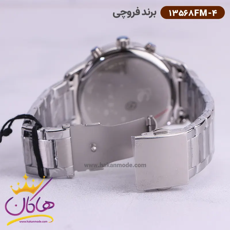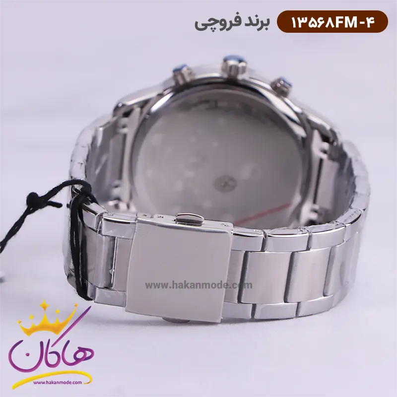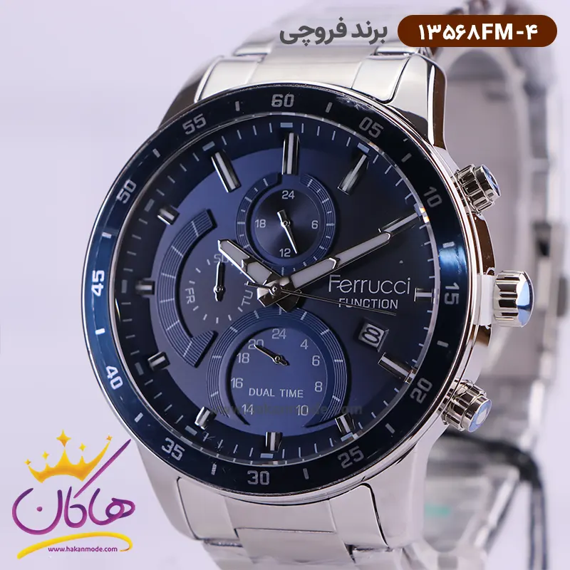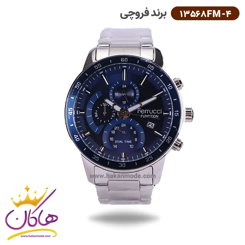 ساعت فروچی مردانه فلزی نقره ای صفحه سورمه ای 13568fm/4 ظاهری مدرن و جذاب دارد. این ساعت استیل نقره‌ای، رنگ ثابت و ضدحساسیت است. اگر به داخل ساعت نگاه کنید، صفحه‌ی این ساعت به رنگ سورمه‌ای است و سه صفحه دایره‌ای کوچک می‌بینید که هر کدام از آنها نشان دهنده‌ی پارامتری خاص هستند. یک صفحه که وسط قرار دارد روز‌های هفته را نشان می‌دهد. صفحه‌ی بالایی ساعت را به صورت 24 ساعته نشان می‌دهد. اگر از افرادی هستید که امور خود را بر اساس تایم 24 ساعته تنظیم می‌کنید این صفحه کوچک به کار شما می‌آید. یک صفحه که پایین قرار دارد dual time یا دو زمانه است. ساعت دو زمانه ساعتی است که به طور هم زمان می‌تواند دو زمان مختلف مربوط به دو منطقه متفاوت را نمایش دهد. به صورتی که می‌توانید با داشتن این ساعت زمان دو کشور متفاوت را در یک صفحه داشته باشید. دور تا دور قاب ساعت اعدادی وجود دارد که ۶۰ دقیقه‌ی ساعت را نشان می‌دهد. یک مربع کوچک کنار عدد ۴ قرار دارد که همان تقویم ساعت است. بند ساعت فلزی با بافت‌های ریز و درشت و از نوع مرغوب است که باعث تعرق و خارش نمی‌شود. اندکس‌های این ساعت به صورت خطی نقره‌ای و عقربه‌های آن شبنما طراحی شده‌اند. لوگوی برند فروچی را کنار عدد ۳ می‌بینید. قفل این ساعت از نوع سه‌تکه دکمه‌دار است و ساعت به راحتی از دست نمی‌افتد. در کنار صفحه یک پیچ کوک و دو دکمه برای تنظیم زمان وجود دارد.