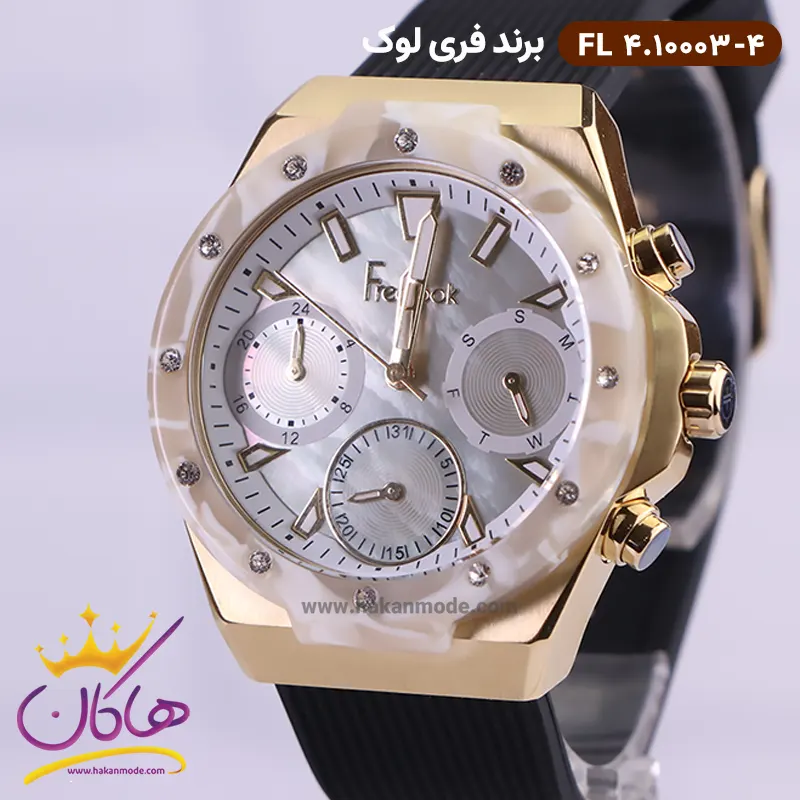ساعت فری لوک زنانه بند رابر مشکی صفحه صدفی 10003/4 ظاهری مدرن و جذاب دارد. قاب این ساعت استیل طلایی، رنگ ثابت و ضدحساسیت است. یک قاب صدفی روی این قاب قرار دارد که با نگینهای اتمی تزئین شده است و همین خصوصیت ظاهر ساعت را جذابتر کرده است. اگر به داخل ساعت نگاه کنید، صفحهی این ساعت به رنگ سفید صدفی است و سه صفحه دایرهای کوچک میبینید که هر کدام از آنها نشان دهندهی پارامتری خاص هستند. یک صفحه که سمت راست قرار دارد روزهای هفته را نشان میدهد. صفحهی سمت چپ ساعت را به صورت ۲۴ ساعته نشان میدهد. اگر از افرادی هستید که امور خود را بر اساس تایم ۲۴ ساعته تنظیم میکنید این صفحه کوچک به کار شما میآید. یک صفحه که پایین قرار دارد روزهای ماه را نشان میدهد. بند ساعت رابر مشکی رنگ، مرغوب و ضد حساسیت است. این بند باعث تعرق و خارش نمیشود و قفل آن از مدل کمربندی (سگکی) است که از دسته قفلهای محکم و مطمئن بشمار میرود. اندکسهای این ساعت طرحهای هندسی متفاوتی هستند و عقربههای آن طلایی و شبنما طراحی شدهاند. لوگوی برند فری لوک را زیر عدد ۱۲ میبینید.