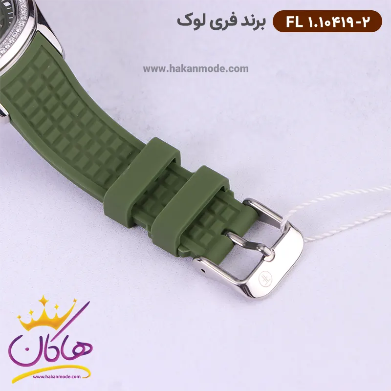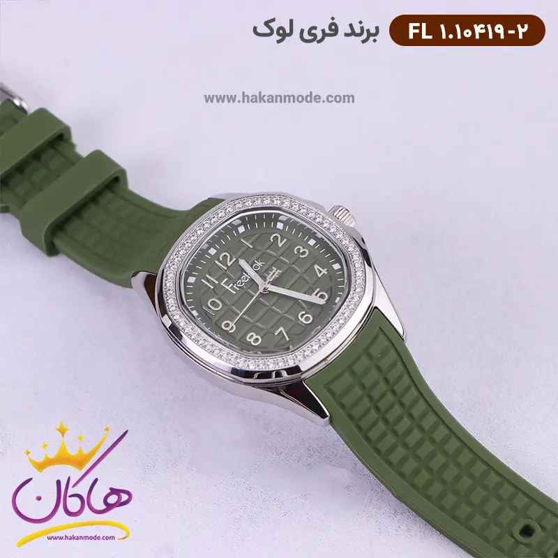 قفل ساعت فری لوک زنانه بند رابر سبز صفحه نگین دار 10419/2