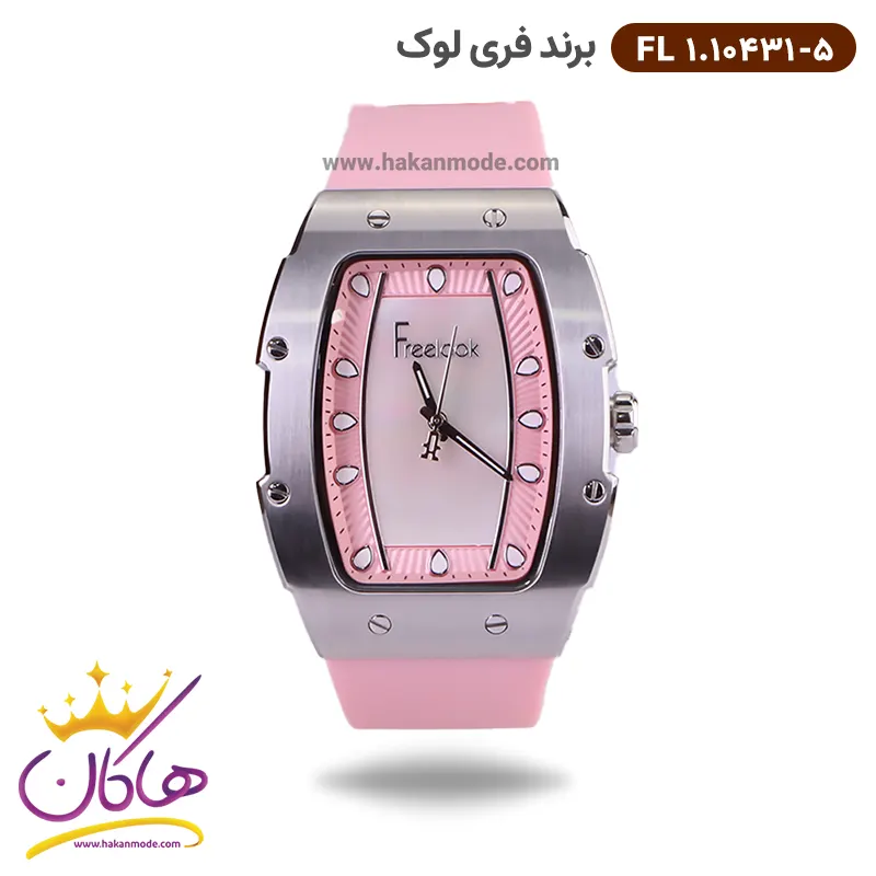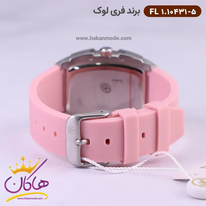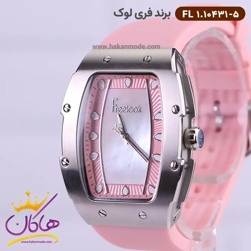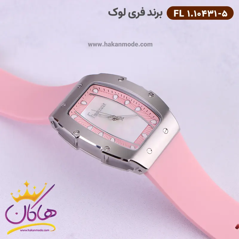 ساعت فری لوک زنانه بند رابر صورتی قاب نقره ای 10431/5 ظاهری شیک و جذاب دارد. قاب این ساعت استیل نقرهای، رنگ ثابت و ضدحساسیت است. اصلیترین چیزی که در ساعت زنانه فری لوک توجه ما را به خود جلب میکند، صفحهی نسبتا مستطیل شکل ساعت است که دور تا دور آن با پیچهای کوچک تزئین شده است. اگر به داخل ساعت نگاه کنید یک صفحه سفید صدفی میبینید که حاشیهی دور آن صورتی رنگ و شیاردار است و اندکسهای آن مانند یک قطره طراحی شدهاند. نام برند فری لوک زیر ساعت 12 دیده میشود. در کنار صفحه یک پیچ کوک برای تنظیم زمان وجود دارد. بند ساعت رابر صورتی رنگ، مرغوب و ضد حساسیت است. این بند باعث تعرق و خارش نمیشود و قفل آن از مدل کمربندی (سگکی) است که از دسته قفلهای محکم و مطمئن بشمار میرود.