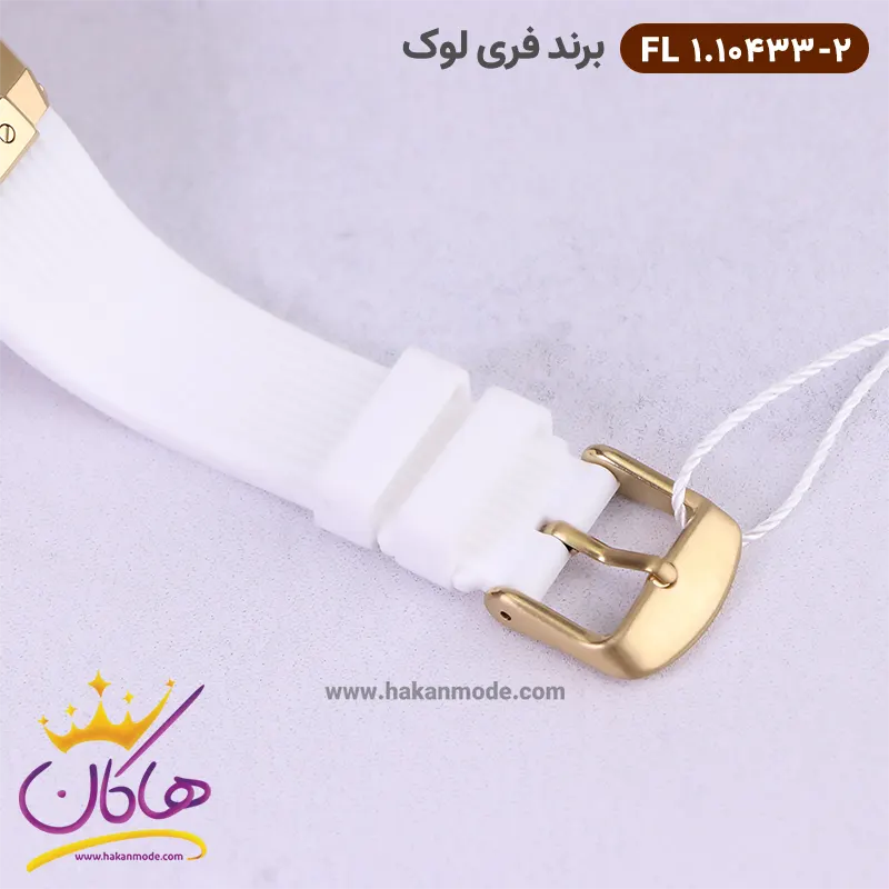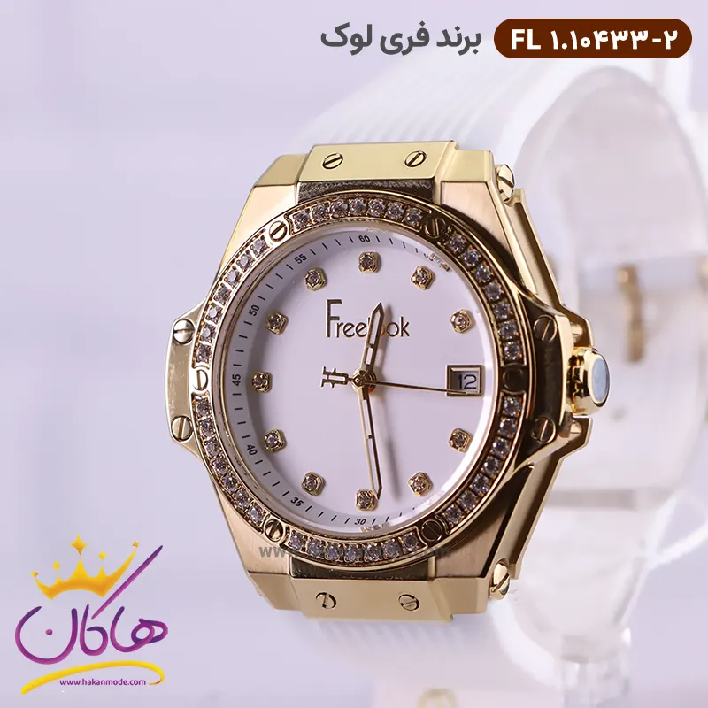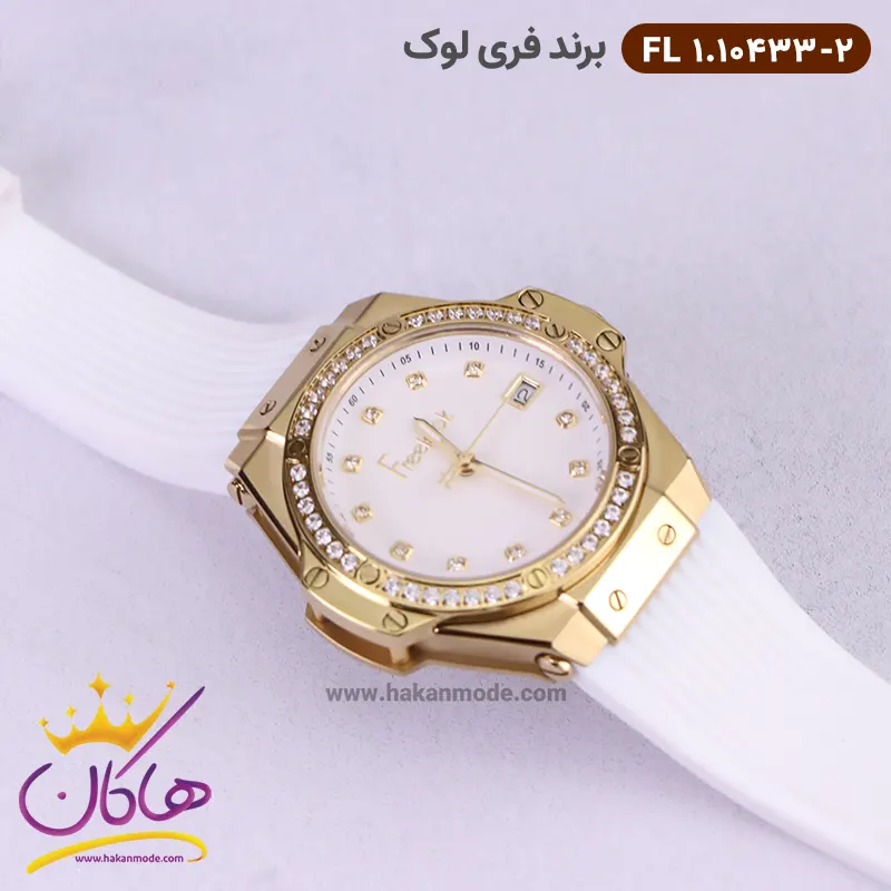 قفل ساعت فری لوک زنانه بند رابر سفید قاب نگین دار 10433/2