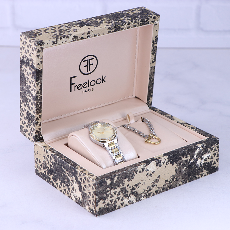 ساعت فری لوک زنانه فلزی قاب نگین‌دار ظاهری کلاسیک و جذاب دارد. این ساعت استیل نقره‌ای/طلایی، رنگ ثابت و ضدحساسیت است. اصلی‌ترین چیزی که در ساعت زنانه فری لوک توجه ما را به خود جلب می‌کند، همخوانی رنگ بند با قاب طلایی ساعت است. اگر به داخل ساعت نگاه کنید یک صفحه طلایی میبینید که اندکس‌های آن به صورت نگینی طراحی شده‌اند. دور تا دور قاب این ساعت با نگین تزئین شده است. نام برند فری لوک زیر ساعت 12 دیده می‌شود. در کنار صفحه یک پیچ کوک برای تنظیم زمان وجود دارد. بند ساعت، از یک بافت ریز و درشت تشکیل شده و به رنگ نقره ای/طلایی است. همچنین جنس بند فلزی و از نوع استیل مرغوب است که باعث تعرق و خارش نمی‌شود. قفل آن از مدل دوتکه‌ قفل‌دار است که از دسته قفل‌های محکم و مطمئن است. این ساعت شیک Freelook یک گردنبند استیل نقره‌ای طلایی نیز به همراه خود دارد که جلوه‌ای خاص و متفاوت به استایل شما می‌بخشد.