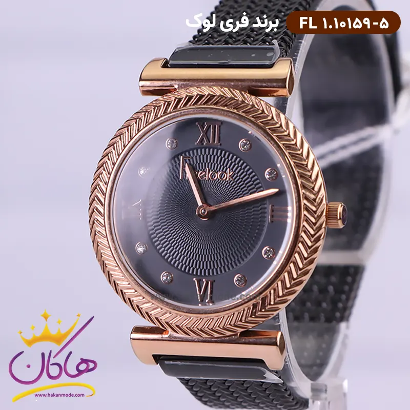 ساعت فری لوک زنانه فلزی بند حصیری قاب رزگلد 0159/5 ظاهری کلاسیک و جذاب دارد. این ساعت استیل مشکی/رزگلد، رنگ ثابت و ضدحساسیت است. اصلیترین چیزی که در ساعت زنانه فری لوک توجه ما را به خود جلب میکند، همخوانی رنگ بند با صفحهی مشکی ساعت است. اگر به داخل ساعت نگاه کنید یک صفحه مشکی شیاردار میبینید که دور تا دور قاب آن تراش کاری شده است. اندکسهای آن به صورت ترکیبی نگینی و لاتین هستند. اندکسهای ساعت به رنگ رزگلد طراحی شدهاند. نام برند فری لوک زیر ساعت ۱۲ دیده میشود. در کنار صفحه یک پیچ کوک برای تنظیم زمان وجود دارد. بند ساعت، از نوع حصیری و به رنگ مشکی است. همچنین جنس بند فلزی و از نوع استیل مرغوب است که باعث تعرق و خارش نمیشود. قفل آن از مدل کلیپسی است که از دسته قفلهای محکم و مطمئن است.