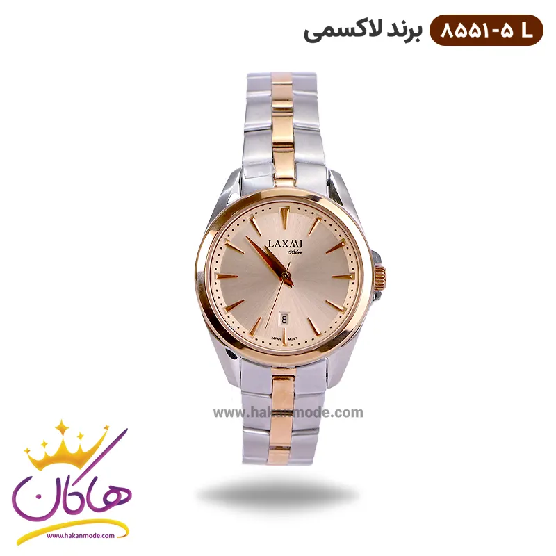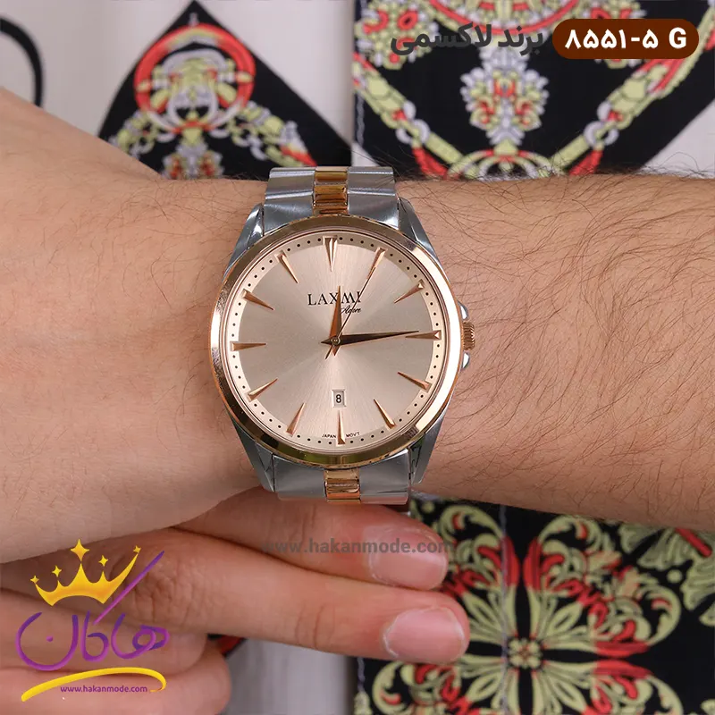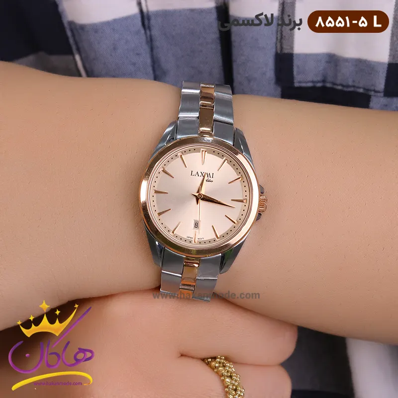 ساعت مچی ست لاکسمی فلزی صفحه طلایی 8551/5 ظاهری کلاسیک و جذاب دارد. این ساعت استیل نقره‌ای/رزگلد، رنگ ثابت و ضدحساسیت است. اصلی‌ترین چیزی که در ساعت ست لاکسمی توجه ما را به خود جلب می‌کند، هم‌رنگ بودن بند و قاب رزگلد است که بر سادگی و شیکی آن افزوده است. عقربه‌های این ساعت‌ها، مدل دوفین و اندکس‌‌های خطی، که انتهای آنها کمی تیز می‌شود. اگر به درون صفحه نگاه کنید، متوجه می‌شوید که صفحه‌ی ساعت سفید است اما تحت تاثیر شیشه‌ی رزگلد آن، صفحه به رنگ رزگلد دیده می‌شود. نام برند laxmi زیر ساعت 12 دیده می‌شود. در کنار صفحه یک پیچ کوک برای تنظیم زمان وجود دارد. در بالای عدد 6 مربعی کوچک وجود دارد که نشانگر روز‌های ماه بوده و همان تقویم ساعت است. بند ساعت، فلزی و از نوع استیل مرغوب است که باعث تعرق و خارش نمی‌شود. طرح این بند از یک بافت ریز و درشت تشکیل شده است، قسمت میانی بند رزگلد و کناره‌های آن نقره‌ای هستند. قفل آن از مدل پروانه‌ای دکمه‌دار است که از دسته قفل‌های محکم و مطمئن است.