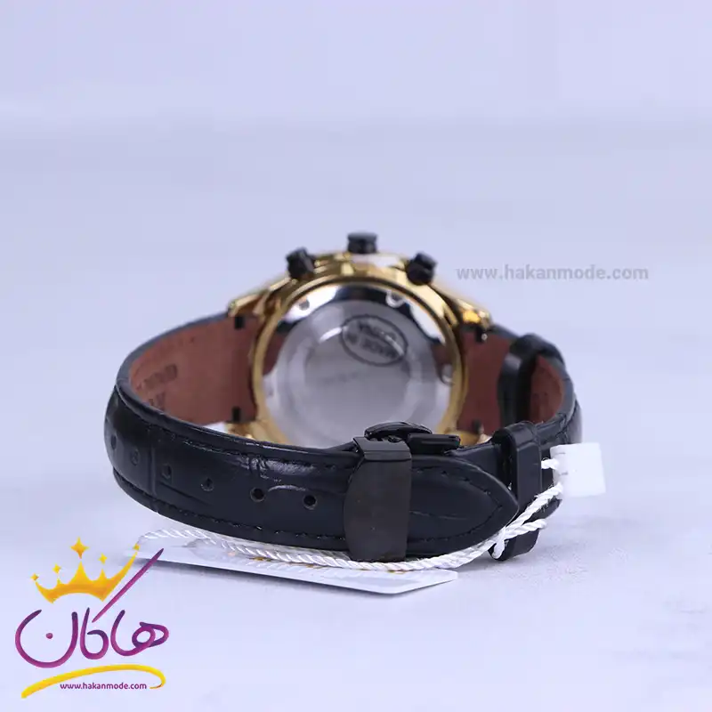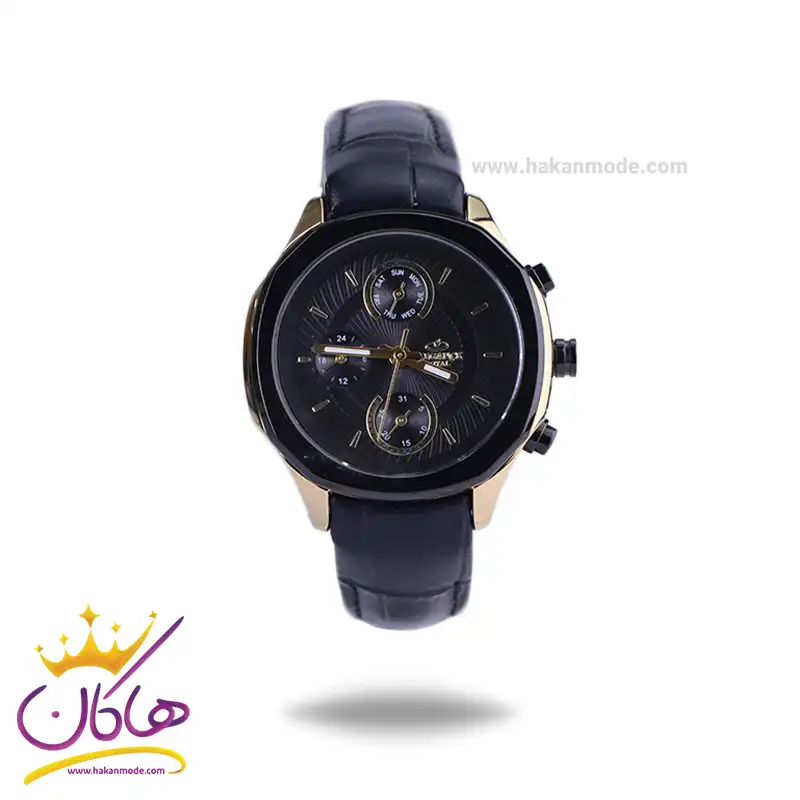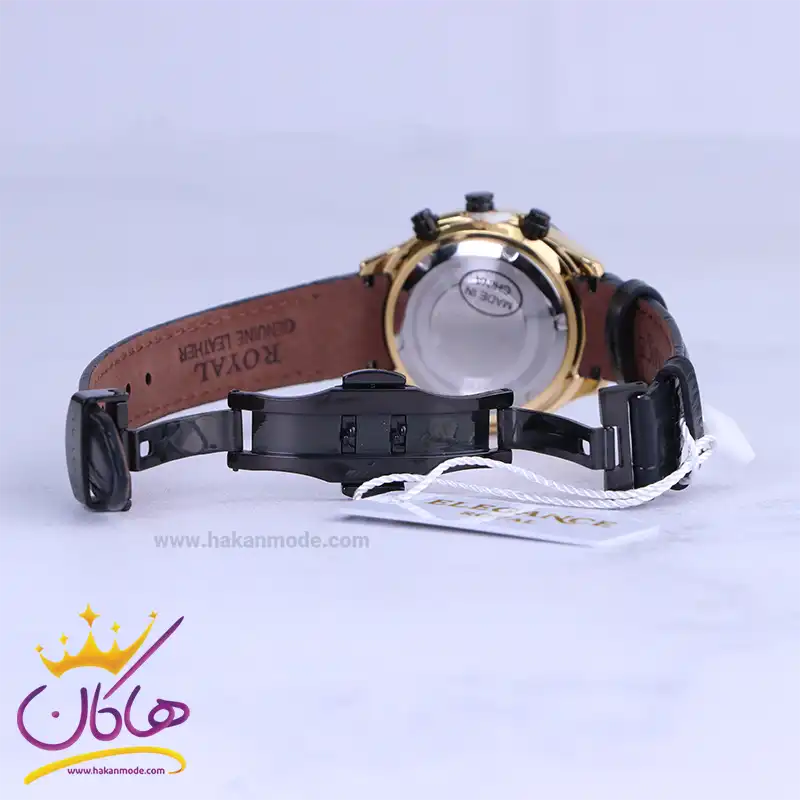 ساعت الگانس رویال زنانه بند چرم مشکی ظاهری مدرن و جذاب دارد. قاب این ساعت به رنگ استیل مشکی/طلایی، رنگ ثابت و ضدحساسیت است. اصلیترین چیزی که در ساعت زنانه الگانس توجه ما را به خود جلب میکند، صفحهی طرحدار و مشکی رنگ ساعت است. اگر به داخل ساعت نگاه کنید، سه صفحهی دایرهای میبینید که دور تا دور آنها قاب طلایی وجود دارد و هر کدام از آنها نشان دهندهی پارامتری خاص هستند. یک صفحه روزهای هفته را نشان میدهد. صفحهی سمت چپی ساعت را به صورت 24 ساعته نشان میدهد. اگر از افرادی هستید که امور خود را بر اساس تایم 24 ساعته تنظیم میکنید این صفحه کوچک به کار شما میآید. یک صفحه که پایین قرار دارد همان تقویم ساعت است. عقربههای این ساعت طلایی رنگ و شبنما هستند و همچنین اندکسهای این ساعت خطی و طلایی براق هستند. نام برند ELEGANCE کنار ساعت 3 دیده میشود. بند ساعت از نوع چرم مرغوب است که پوسته پوسته و بریده نمیشود، همچنین باعث تعرق و خارش نمیشود. قفل این ساعت از مدل پروانهای دکمهدار است و ساعت به راحتی از دست نمیافتد. این مدل قفل، مثل قفل کمربندی روی بند ترک یا بریدگی ایجاد نمیکند و از محبوبترین قفلها است.