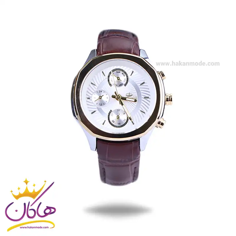 ساعت الگانس زنانه بند چرم قهوهای ظاهری مدرن و جذاب دارد. قاب این ساعت به رنگ استیل طلایی/نقرهای، رنگ ثابت و ضدحساسیت است. علاوه بر ویژگیهای ظاهری اگر به داخل ساعت نگاه کنید، سه صفحهی دایرهای کوچک میبینید که هر کدام نشان دهندهی پارامتری خاص هستند. یک صفحه که بالا قرار دارد روزهای هفته را نشان میدهد. دایرهی پایینی تقویم ساعت است و دایرهی سمت چپی، زمان را به صورت 24 ساعت نشان میدهد. داشتن اندکسهای خطی طلایی و عقربههای شب رنگ به شما این امکان را میدهد که در شب و محیطهای کم نور هم گذر زمان را ببینید. اگر به درون صفحه سفید رنگ و طرحدار ساعت نگاه کنید، نام برند ELEGANCE کنار ساعت 3 قرار دارد. بند ساعت از نوع چرم مرغوب است که پوسته پوسته و بریده نمیشود، همچنین باعث تعرق و خارش نمیشود. قفل این ساعت از مدل پروانهای دکمهدار است و ساعت به راحتی از دست نمیافتد. این مدل قفل، مثل قفل کمربندی روی بند ترک یا بریدگی ایجاد نمیکند و از محبوبترین قفلها است.