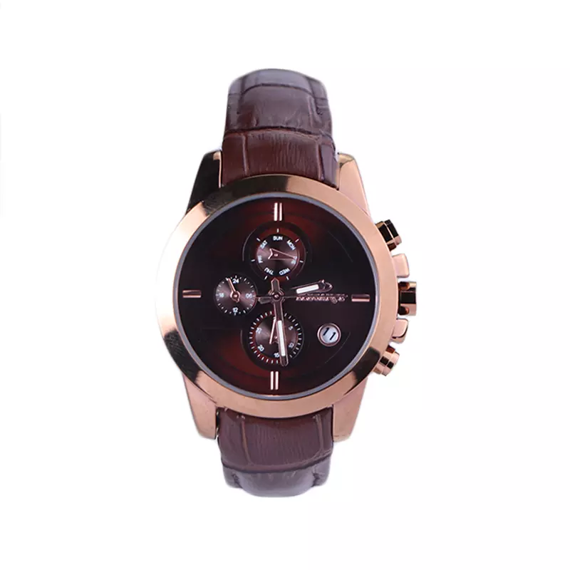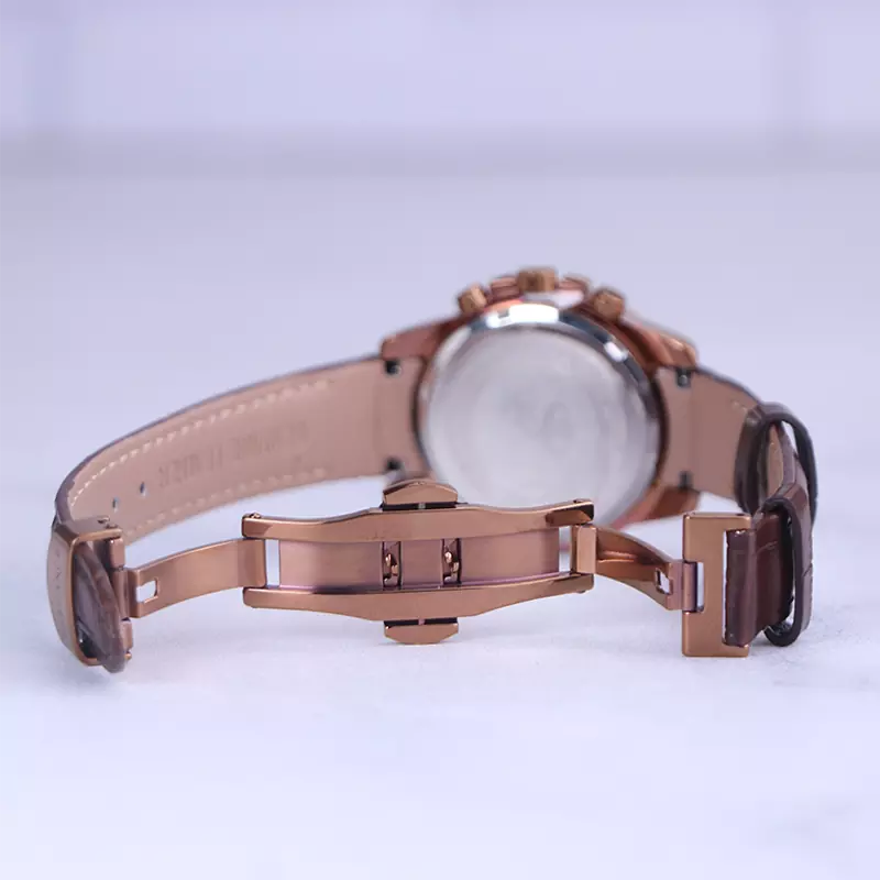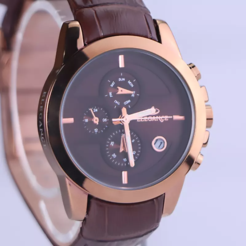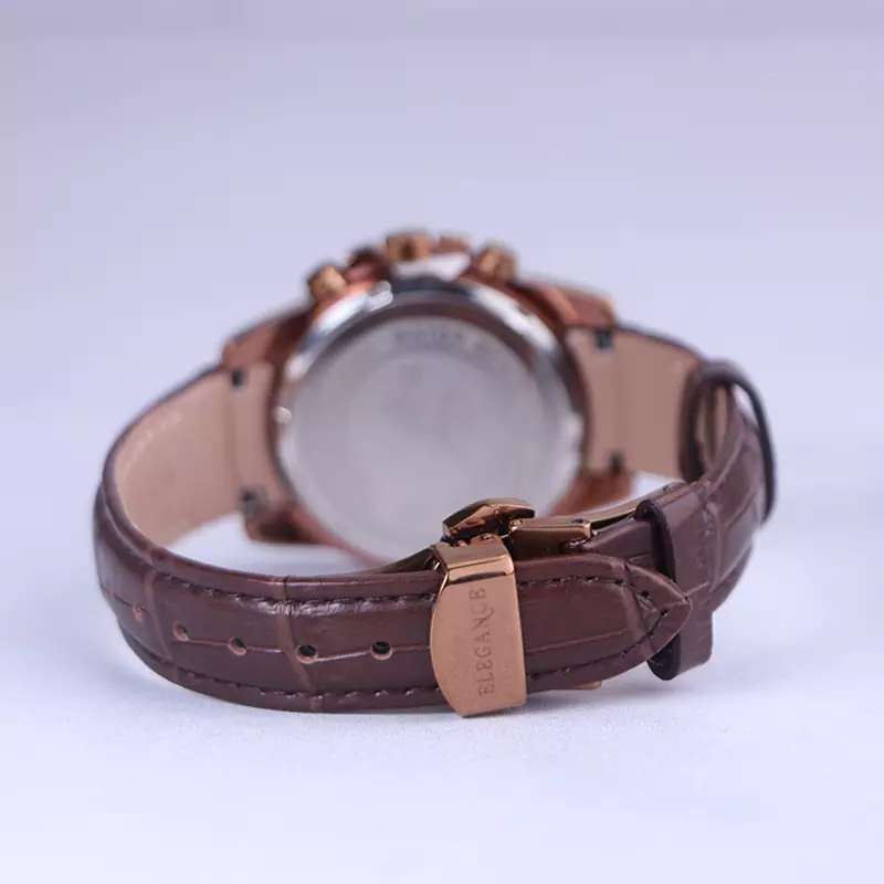 ساعت الگانس زنانه بند چرم قهوهای ظاهری مدرن و جذاب دارد. قاب این ساعت به رنگ استیل رزگلد، رنگ ثابت و ضدحساسیت است. در واقع این ساعت، طرح سه موتوره است و صفحات کوچکی که میبینید، نمایشی هستند. داشتن اندکسهای خطی رزگلد و عقربههای شب رنگ به شما این امکان را میدهد که در شب و محیطهای کم نور هم گذر زمان را ببینید. اگر به درون صفحه قهوهای رنگ ساعت نگاه کنید، نام برند ELEGANCE کنار ساعت 3 قرار دارد. یک دایره کوچک کنار عدد 4 قرار دارد که تقویم ساعت است. بند ساعت از نوع چرم مرغوب است که پوسته پوسته و بریده نمیشود، همچنین باعث تعرق و خارش نمیشود. قفل این ساعت از مدل پروانهای دکمهدار است و ساعت به راحتی از دست نمیافتد. این مدل قفل، مثل قفل کمربندی روی بند ترک یا بریدگی ایجاد نمیکند و از محبوبترین قفلها است.